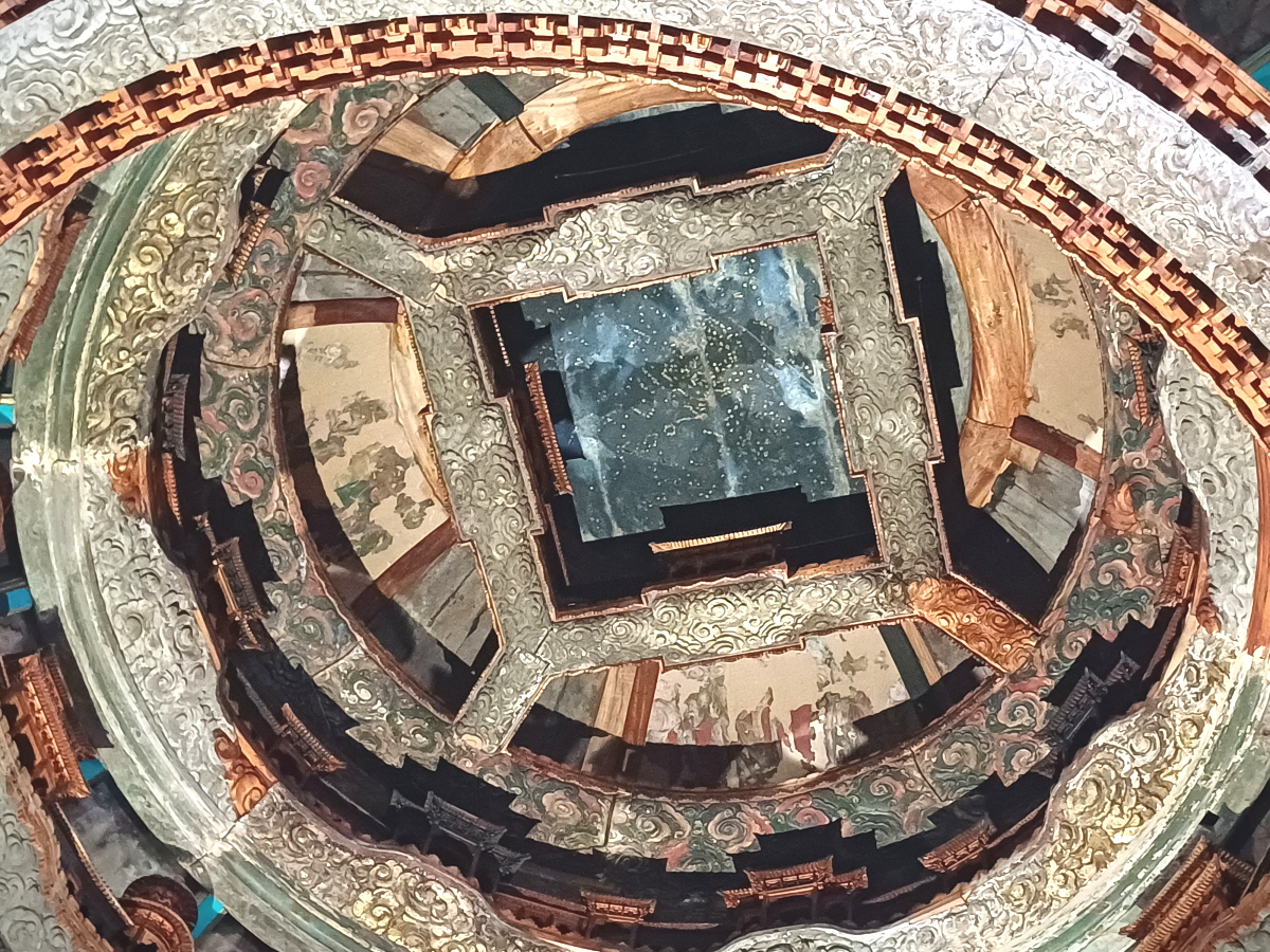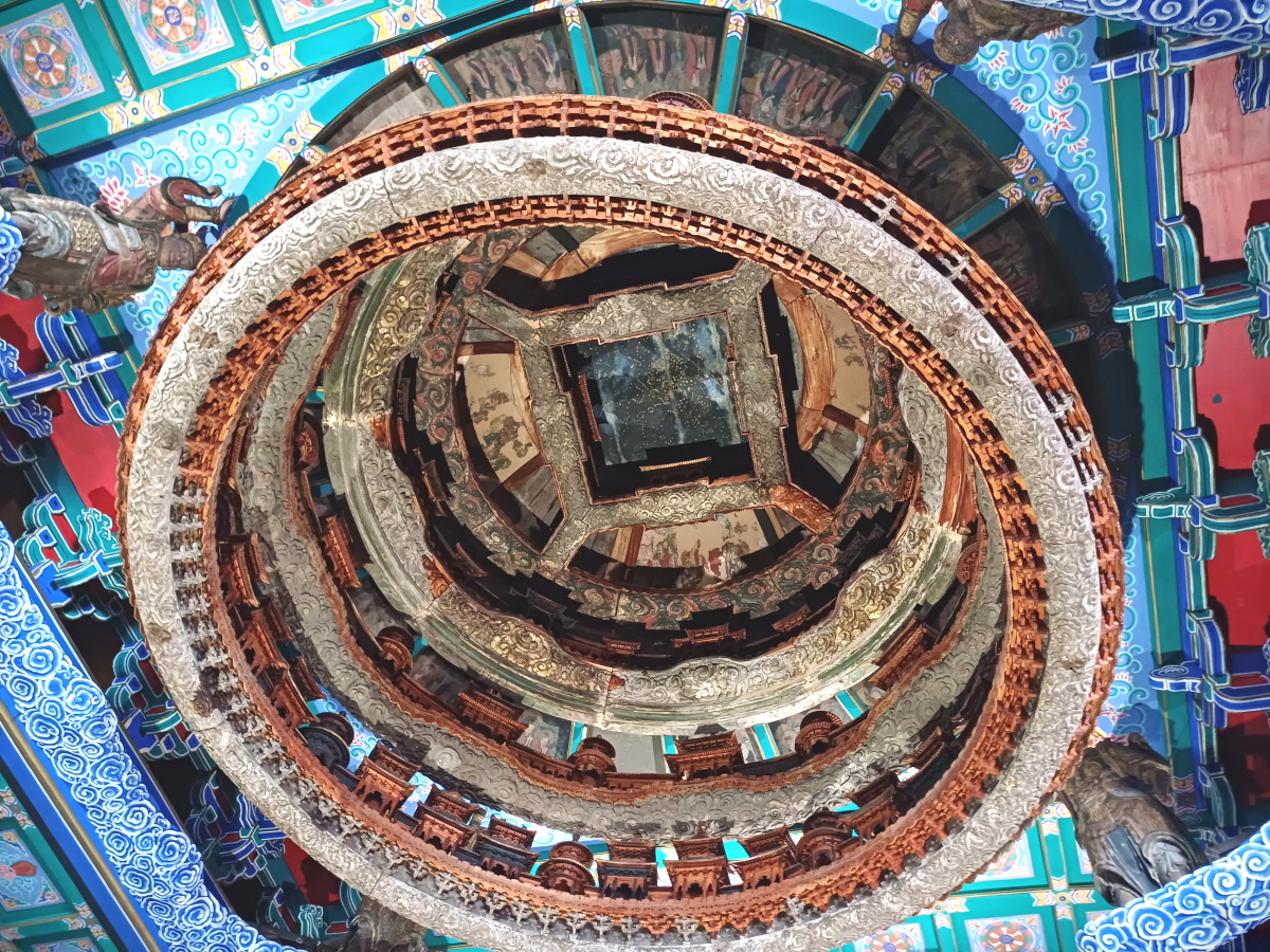 본래 롱푸사의 증각전(證覺殿)에 있던 천장 장식인데 6층의 복합 구조체이며, 상단에는 1,400개 이상의 별이 박힌 별자리 지도가 있다고 한다. 층층마다 다양한 모양의 건축물 모형이 가득 차 있는 모습이 정말 인상적이었다.