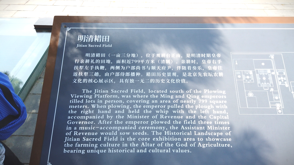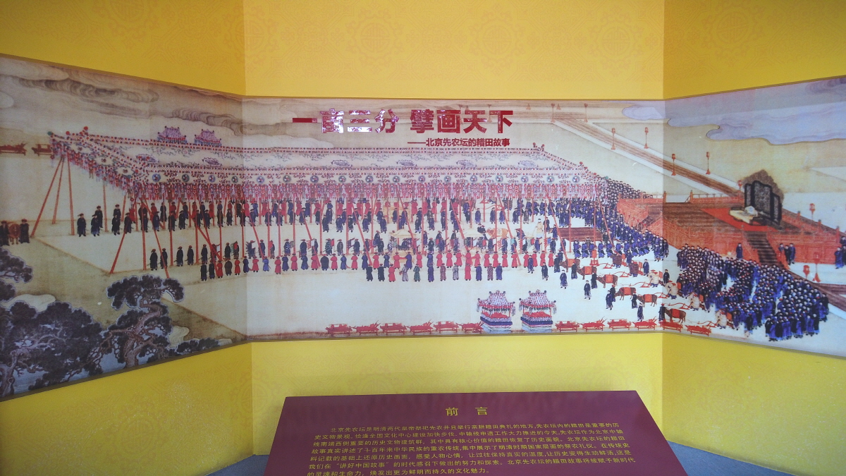 특히 ‘一亩三分地(일무삼분지)’라 불리는 황제의 친경지(1묘 3분, 약 0.07㏊)가 이곳에 남아 있으며, 관청대신과 관리들이 직접 농사를 도왔습니다. 이 의식은 황제의 백성에 대한 본보기이자 국왕의 책임을 상징하는 의례였습니다.
