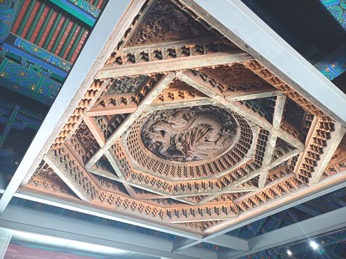 이 천장 장식은 베이징 롱푸사(隆福寺)라는 불교사원곳의 천정에 자리 잡고 있던 것인데, 1976년 탕산 대지진으로 인해 롱푸사 건물에 심각한 손상을 입어 주요 장식품들이 해체 후 흩어져 보관되다가, 선농단의 고대건축박물관으로 옮겨져 보관 전시되고 있다고 한다.