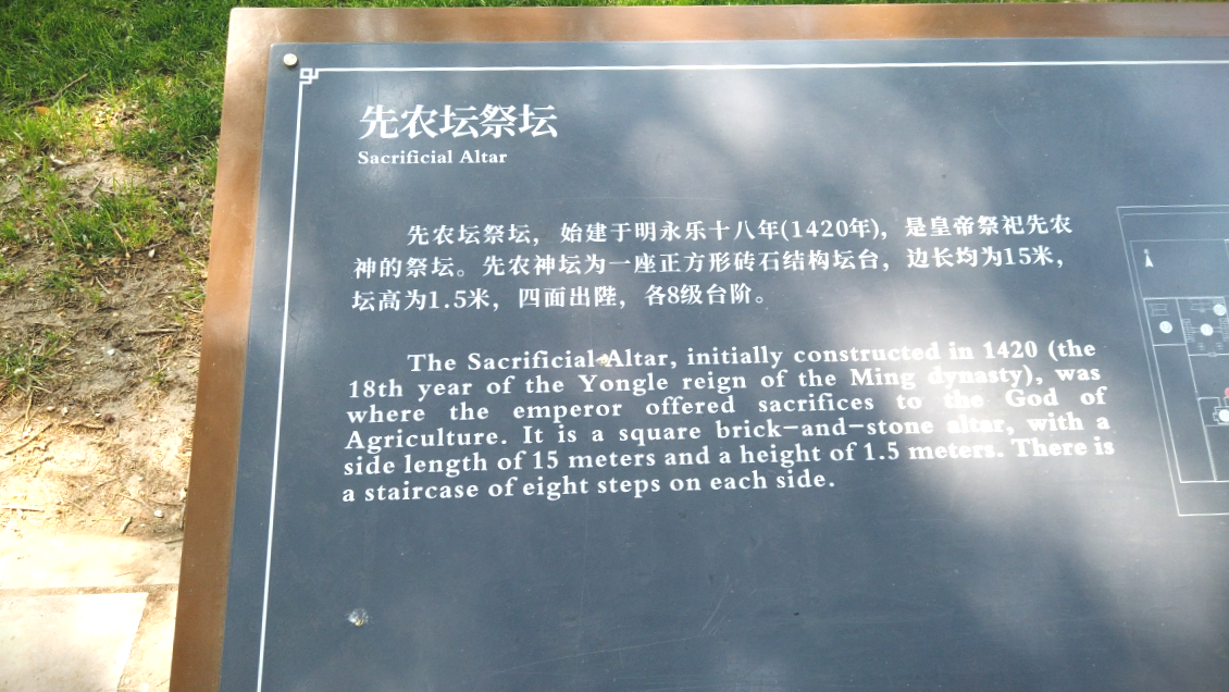 일무삼분지(一亩三分地)라는 명청적천(明清耤田), 명청 시대에 황제가 직접 쟁기질을 하던 농토가 그대로 남아 있는데, 이곳에서 황제가 음악에 맞춰 세 번 쟁기질을 하면 세무대신이 씨앗을 뿌렸다고 한다.
