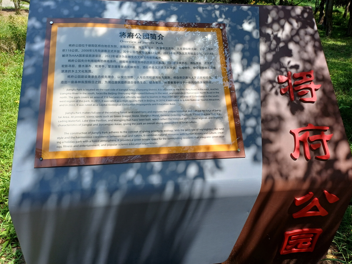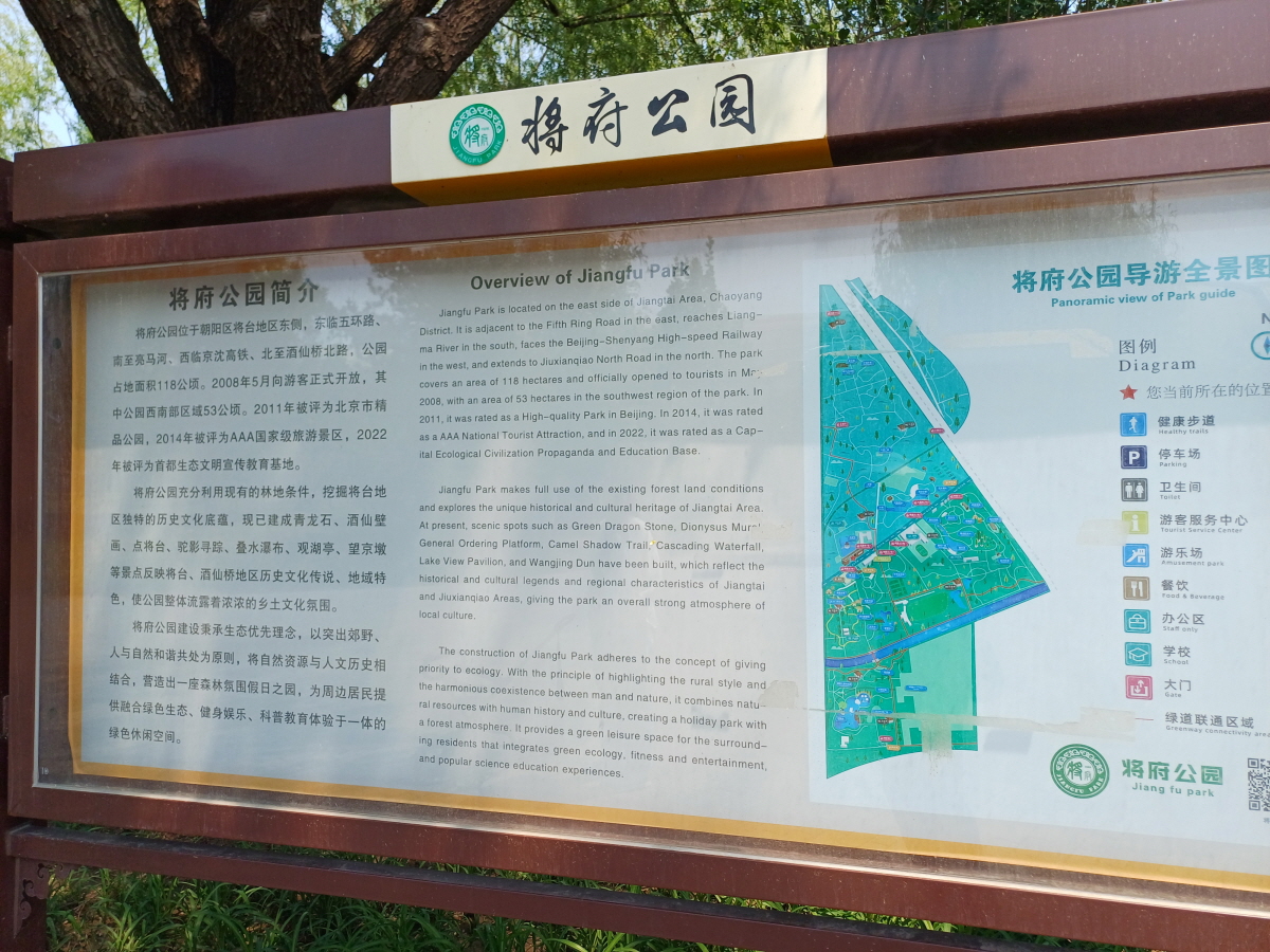 베이징 차오양(朝阳) 구 장타이(将台) 지역에 위치한 将府公园(Jiangfu Park)는 약 58헥타르 규모의 무료 공공 숲 속 공원으로, 2007년 착공해 2008년 1기 완공, 2017~18년 확장되었다.