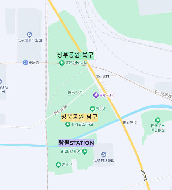 장부공원은 왕징 서쪽에 위치하고 있는데 공원에서 가장 가까운 지하철역은 12호선 타방영(驼房营) 역이다. 대중교통으로 이동하기는 다소 번거로운 곳에 자리 잡고 있기 때문에 택시로 이동하는 것을 추천한다.