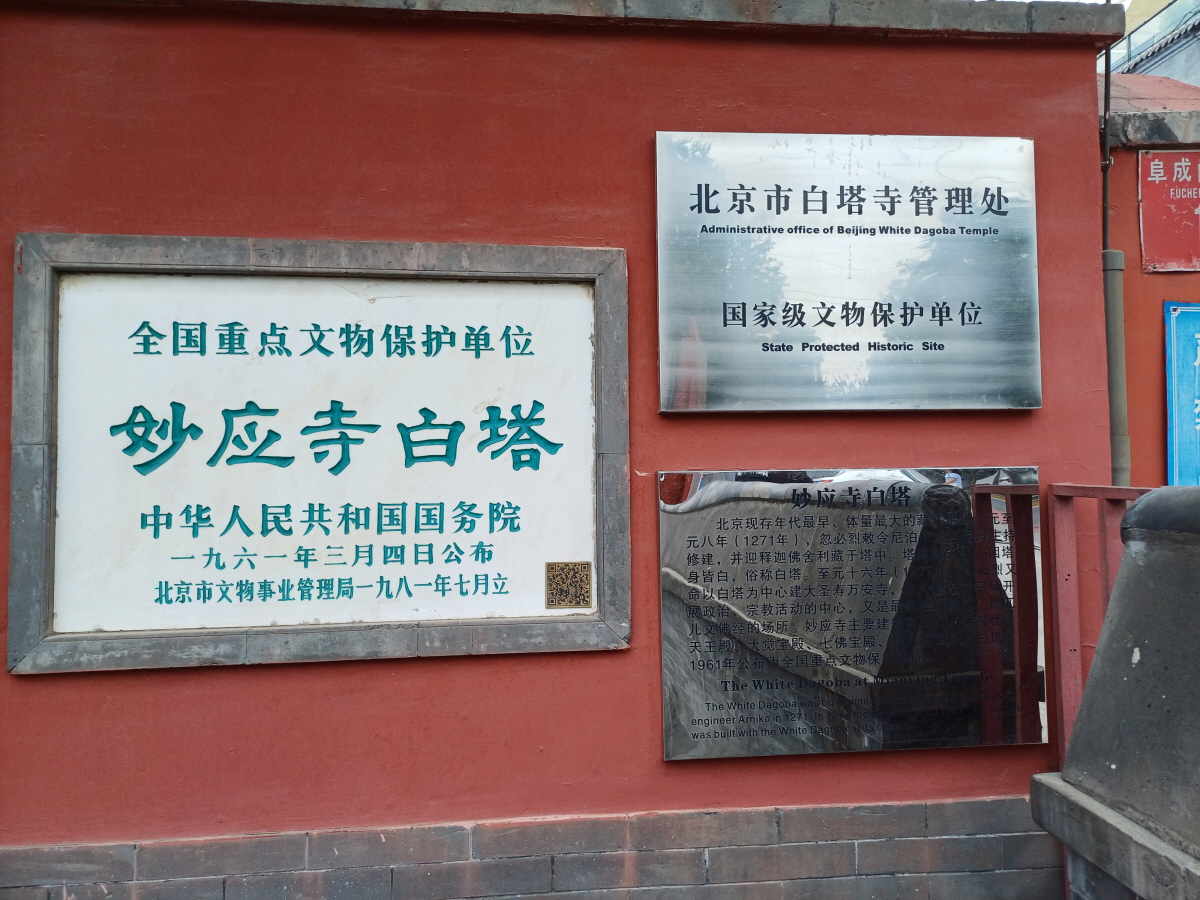 사찰의 입구는 다소 소박했다. 입구에 명판을 살펴보니 묘응사백탑(妙应寺白塔)