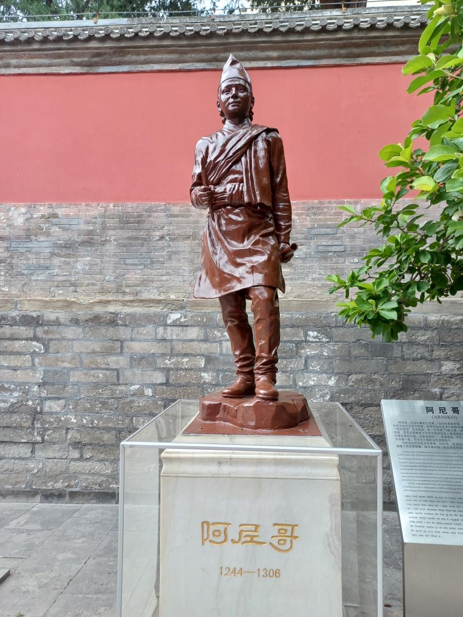 칠불보전 입구 좌측에는 동상이 하나 있는데, 이 백탑의 설계자인 아니고(阿尼哥)의 동상이다. 아니고는 네팔 장인으로 1260년 중국으로 넘어와 원나라에서 40년 넘게 재직했다고 한다. 이 동상은 네팔 아니코 협회에서 2001년 기증을 한 것이라고 한다.