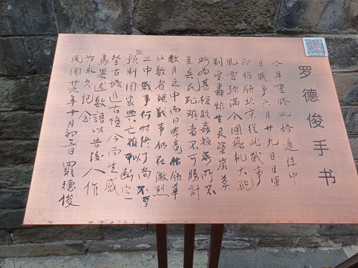 올해 이 탑을 다시 수리한 것은 중일 전쟁 때였고, 6월 29일에 일본군이 베이징을 점령하면서 전쟁의 구름이 전국에 가득해졌고, 비행기와 대포가 여기저기 폭격하여 생명이 도탄에 빠졌습니다. 총살과 약략은 어디에나 있고, 군인과 백성의 희생자는 이루 헤아릴 수 없다. 몇 달 동안 일본은 화북의 여러 성을 점령했으며, 현재 전쟁은 여전히 치열합니다. 전쟁이 언제 끝날지는 아직 예측할 수 없으며, 국가의 흥망은 단정하기 어렵습니다. 고탑에 올라 과거를 회상하고 현재를 회상하며 감명을 받아, 몇 마디 말로 후세에 전하여 영구적으로 기념합니다.