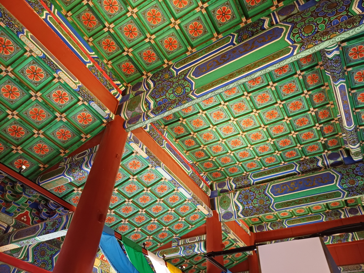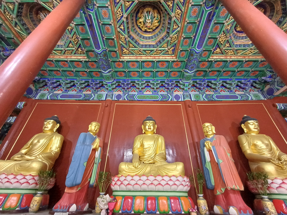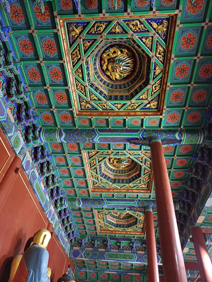 칠불보전인데 안을 살펴보니 불상이 3개만 있었다. 4개는 어디 간 것인가! 불상 위에는 독특한 천장 장식이 3개가 보였는데 용 장식의 모습이 아주 화려했다.