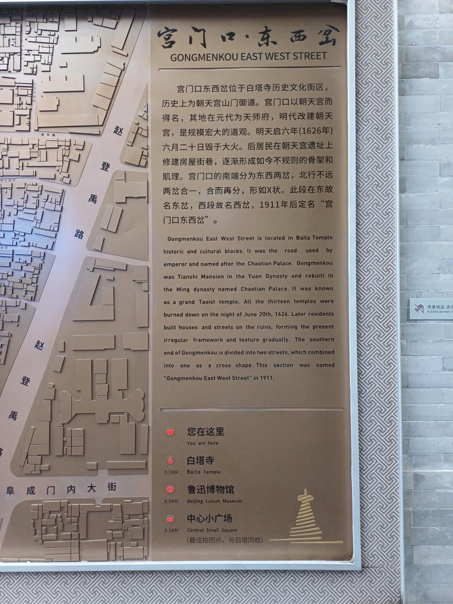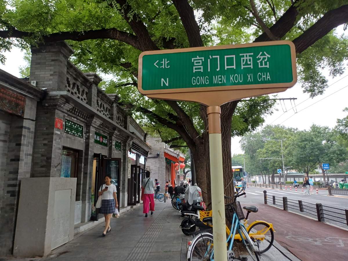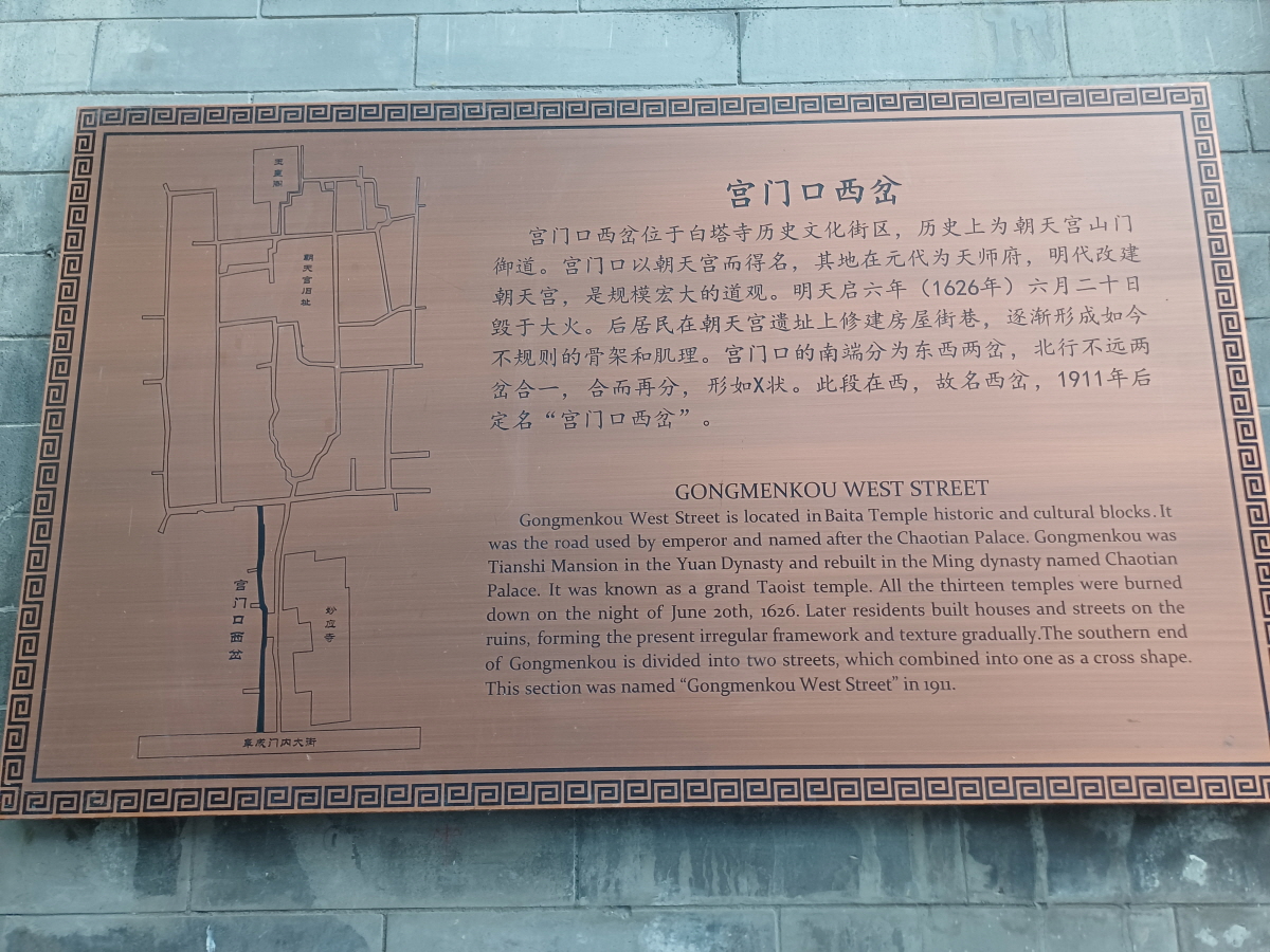 묘응사 서쪽에는 두 갈래의 골목길이 있는데 궁먼커우동차(宫门口东岔)와 궁먼커우시차(宫门口西岔)라는 곳이다. 궁 문입구 동쪽/서쪽 갈림길이라는 뜻이다.