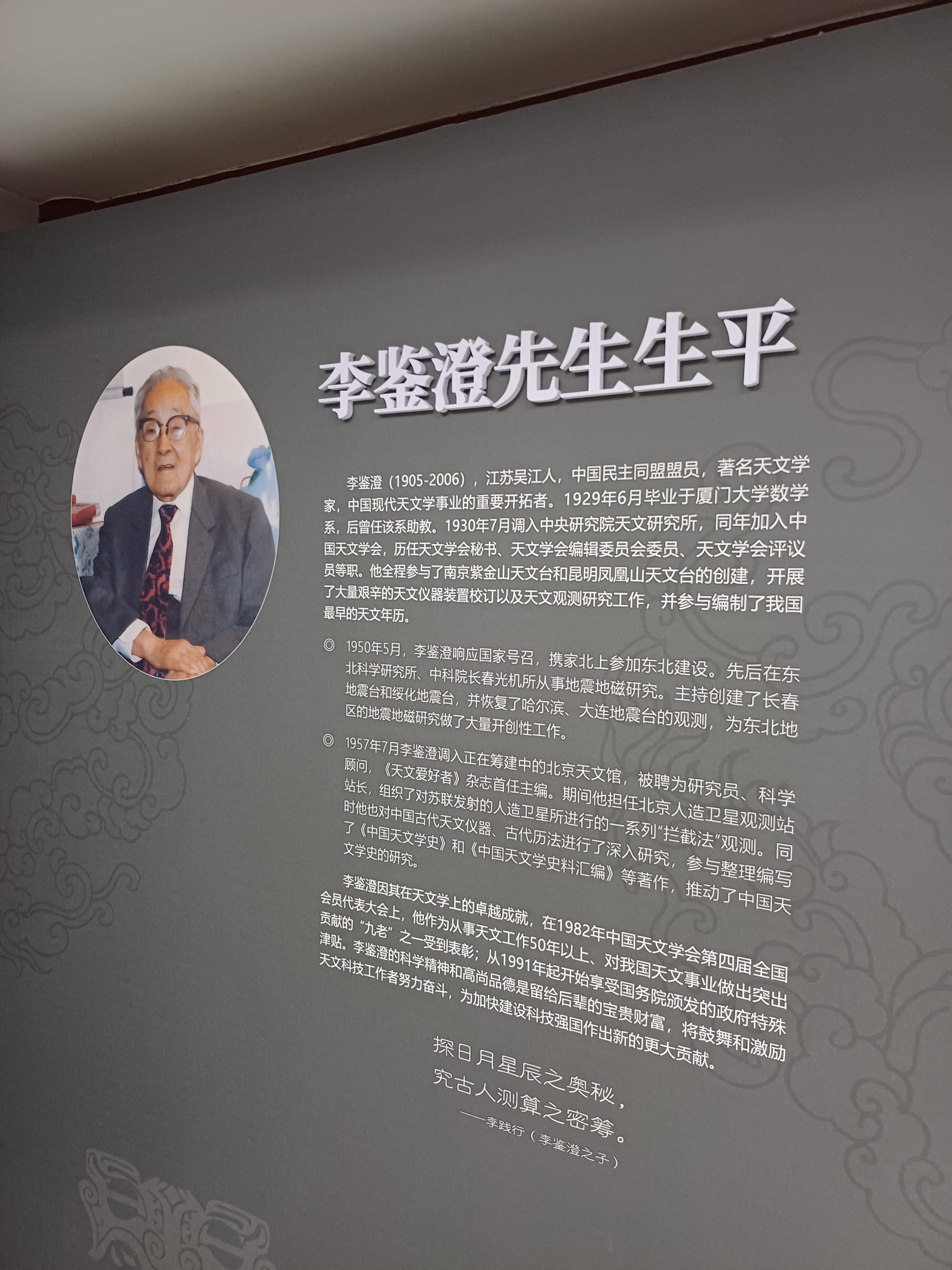 이감징(李鉴澄,1905-2006)이라는 중국 천문학자에 대한 개인 역사에 대한 작은 전시도 있었는데, 중국 현대 천문학의 선구자로 중국 최초의 현대식 천문대인 난징 자금산천문대(紫金山天文台) 건립에 참여했다고 하며 참조로 무려 102세까지 사셨다고 한다. 아무튼 대단한 인물임에는 틀림없어 보였다.