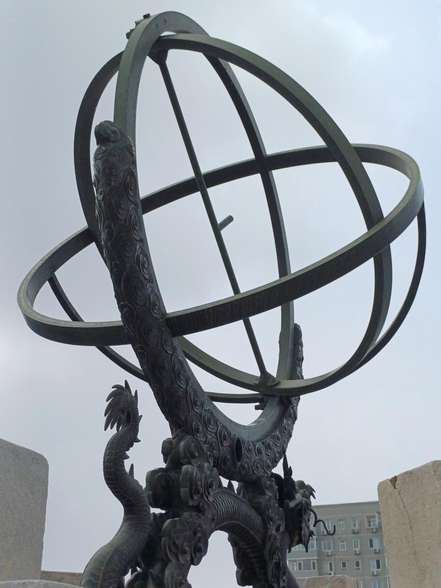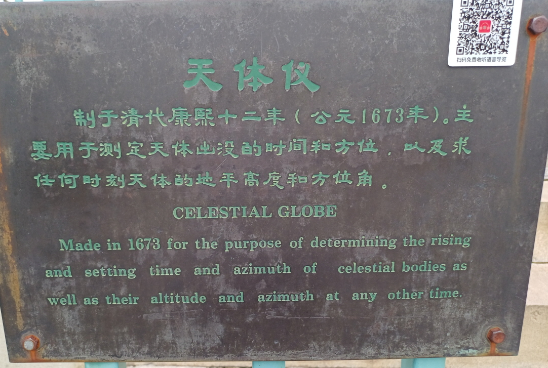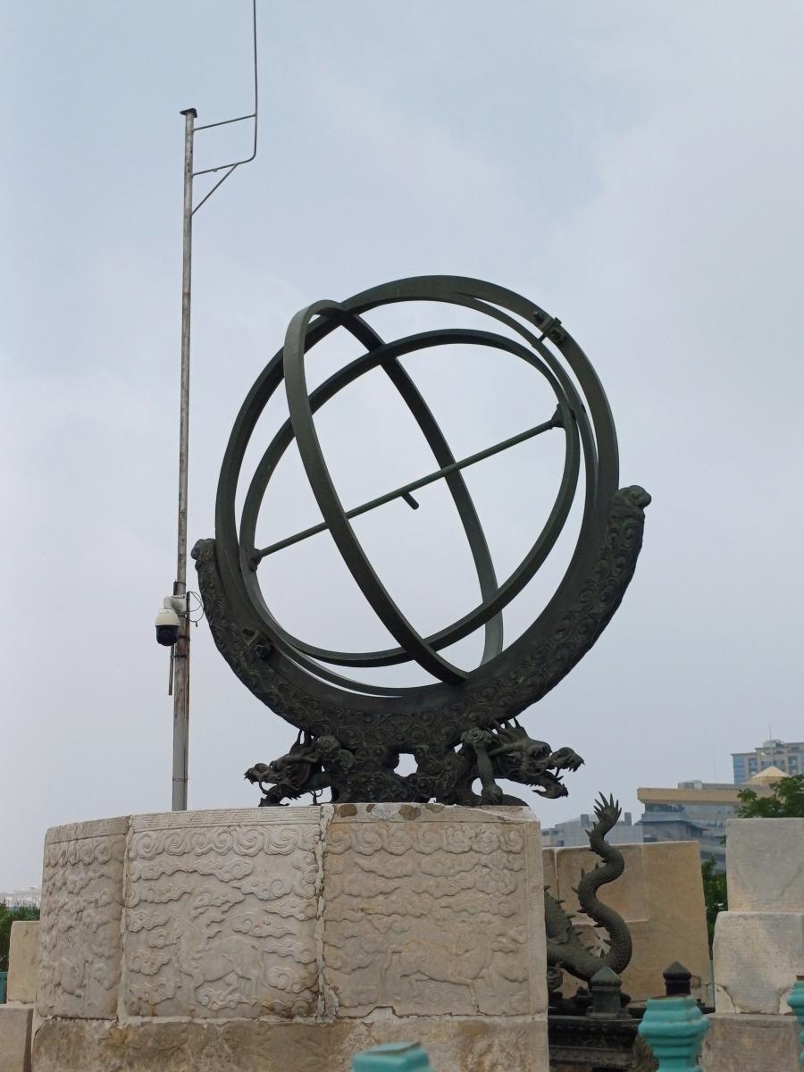 천체의(天体仪), 청나라 강희제 12년(서기 1673년)에 제작되었으며, 천체의 뜨고 지는 시간과 방위각을 측정하는데 사용.