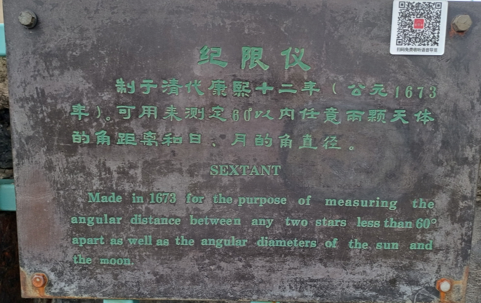 기한계(纪限仪), 청나라 강희제 12년(1673년)에 만들어 졌으며, 60도 이내의 두 천체 사이의 각거리와 태양과 달의 각지름을 측정하는데 사용.
