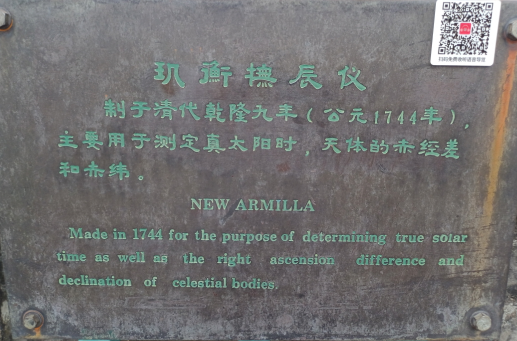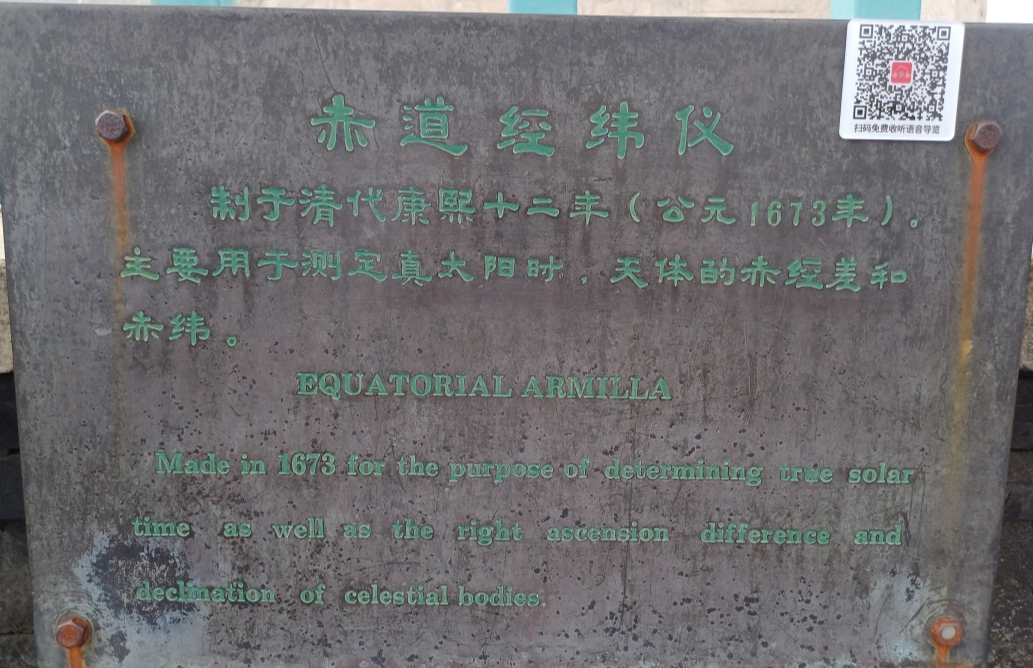 적도경위의(赤道经纬仪), 청나라 강희제 12년(1673년)에 만들어 졌으며, 별과 행성의 위치 측정에 사용.
