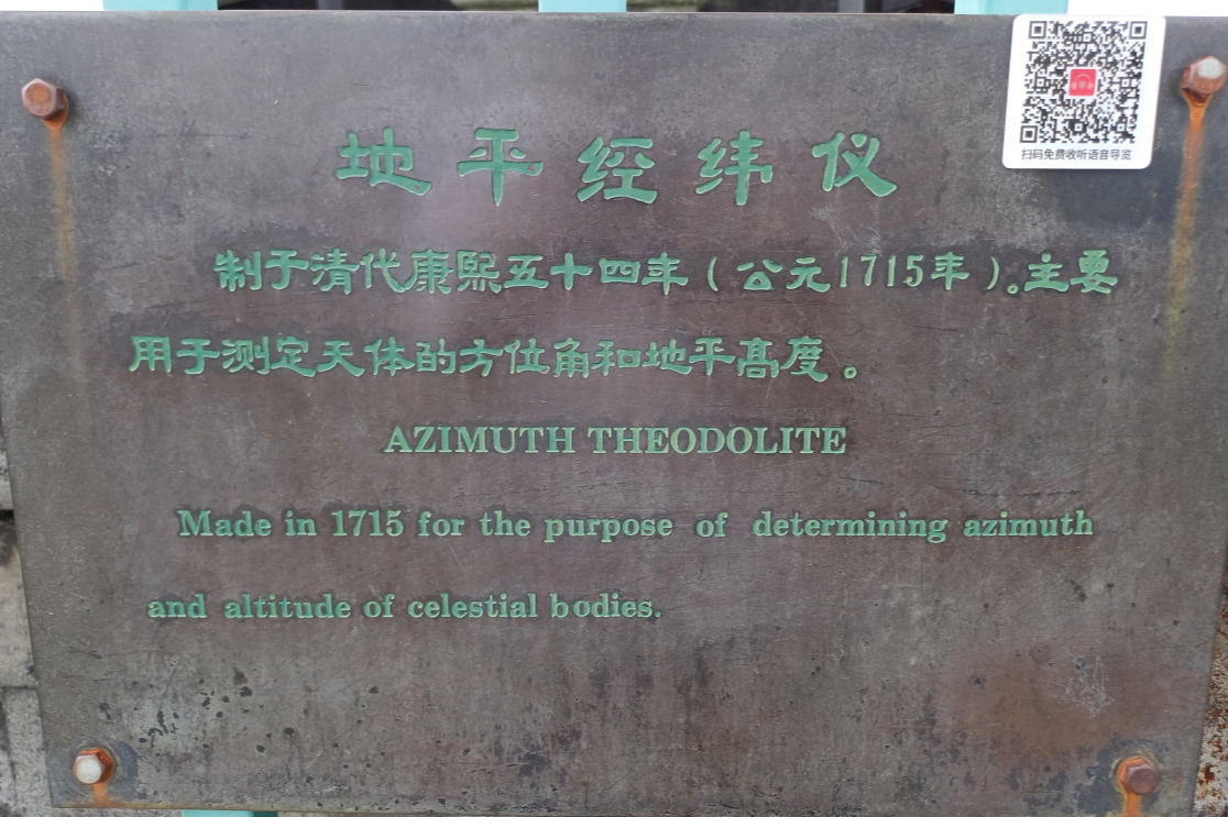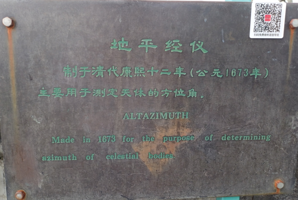 지평경위의( 地平经纬仪), 청나라 강희제 54년(1715년)에 제작되었으며, 천체의 방위각과 고도를 측정하는데 사용.