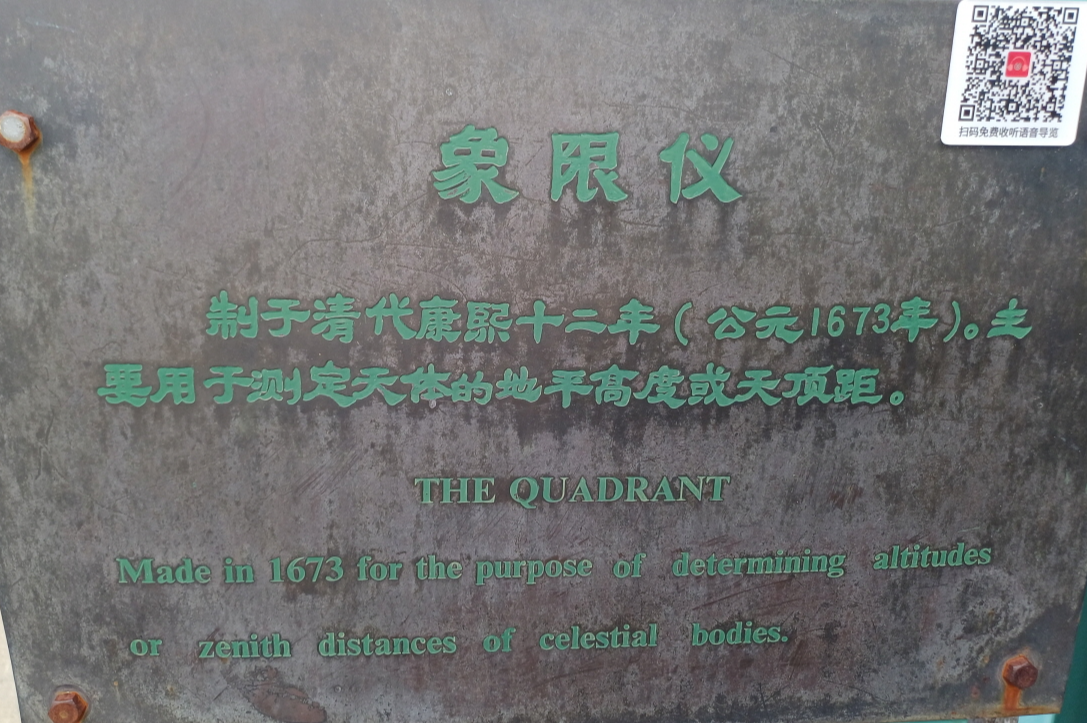 사분의(象限仪), 청나라 강희제 12년(서기 1673년)에 제작되었으며, 천체의 고도를 측정하는데 사용.