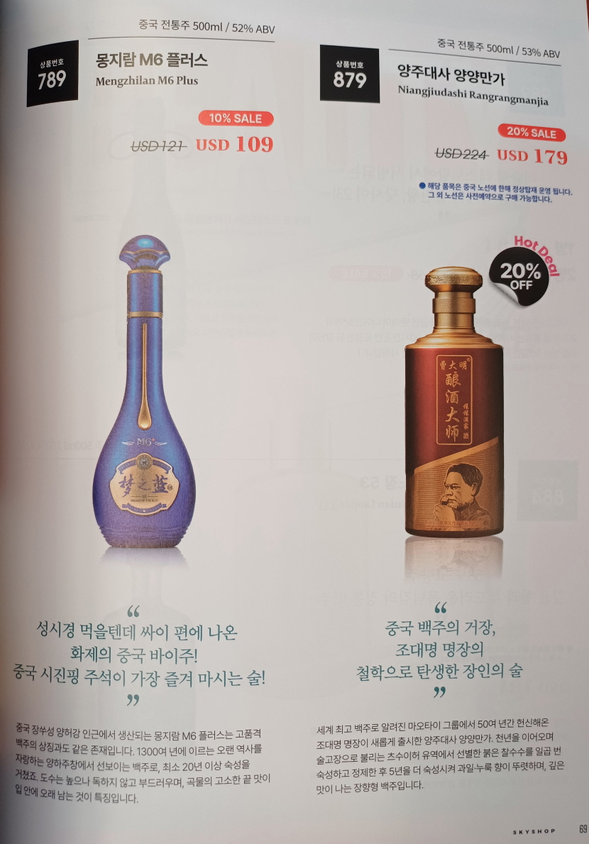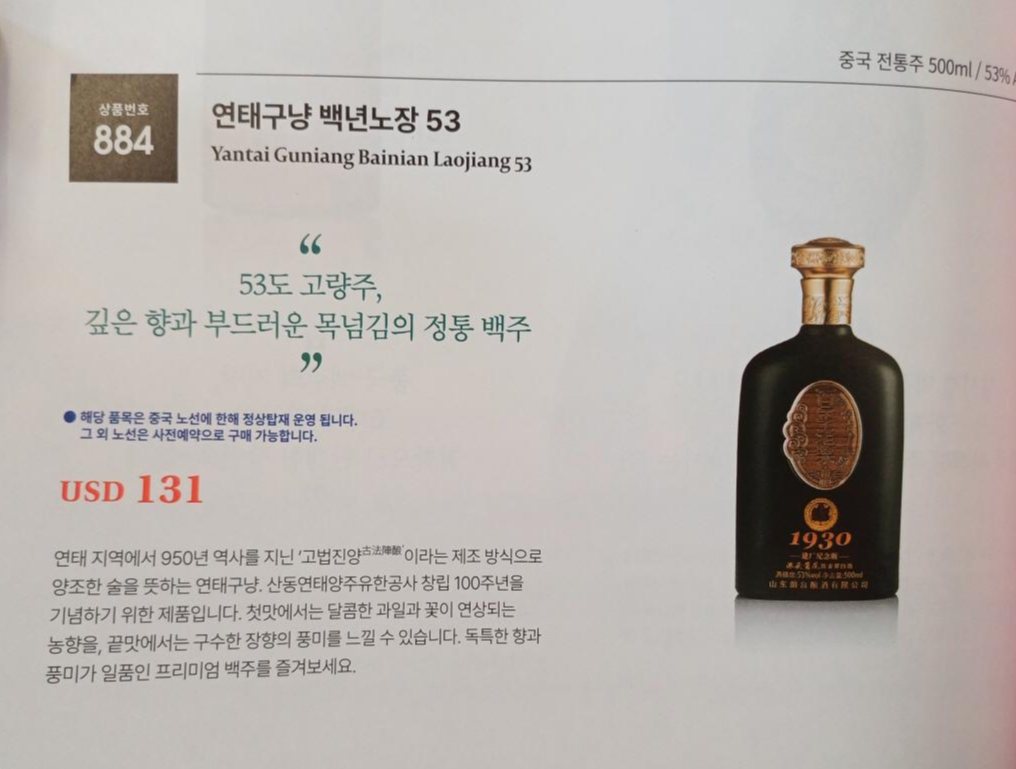 비행기 탑승 후 바로 나의 관심사는 기내 면세점 백주!! 면세점 책자를 바로 뒤져봤다. 기내 면세점에서 판매하는 백주의 종류는 많지 않았는데, 판매하고 있는 제품들의 가격과 중국 온라인 쇼핑몰(징동/京东)에서 판매 중인 가격을 비교해 봤다.