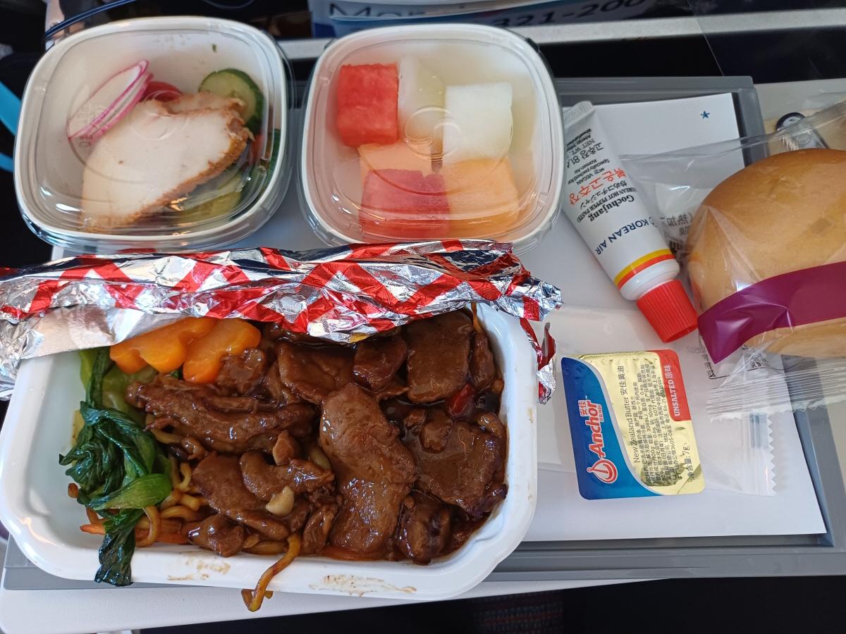 기내 면세점 백주 조사를 마무리한 후 기내식이 나와서 시식을 했다. 소고기 볶음 면과 닭고기 샐러드, 과일, 빵과 버터가 나왔는데 그럭저럭 먹을만했다.