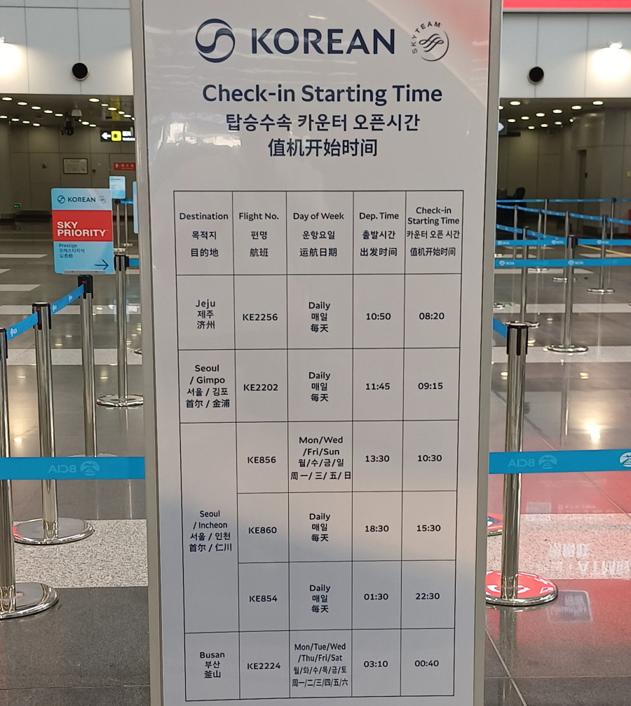 체크인을 하려 카운터로 향하니, 대한항공 탑승수속 카운터 오픈시간 안내표가 보였다. 베이징에서 출발하는 한국 노선 스케줄 및 카운터 오픈 시간이 잘 정리된 거 같아서 아래의 표로 또 정리해 봤다.