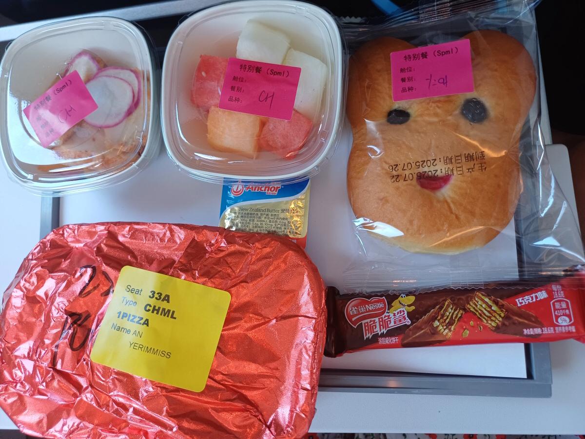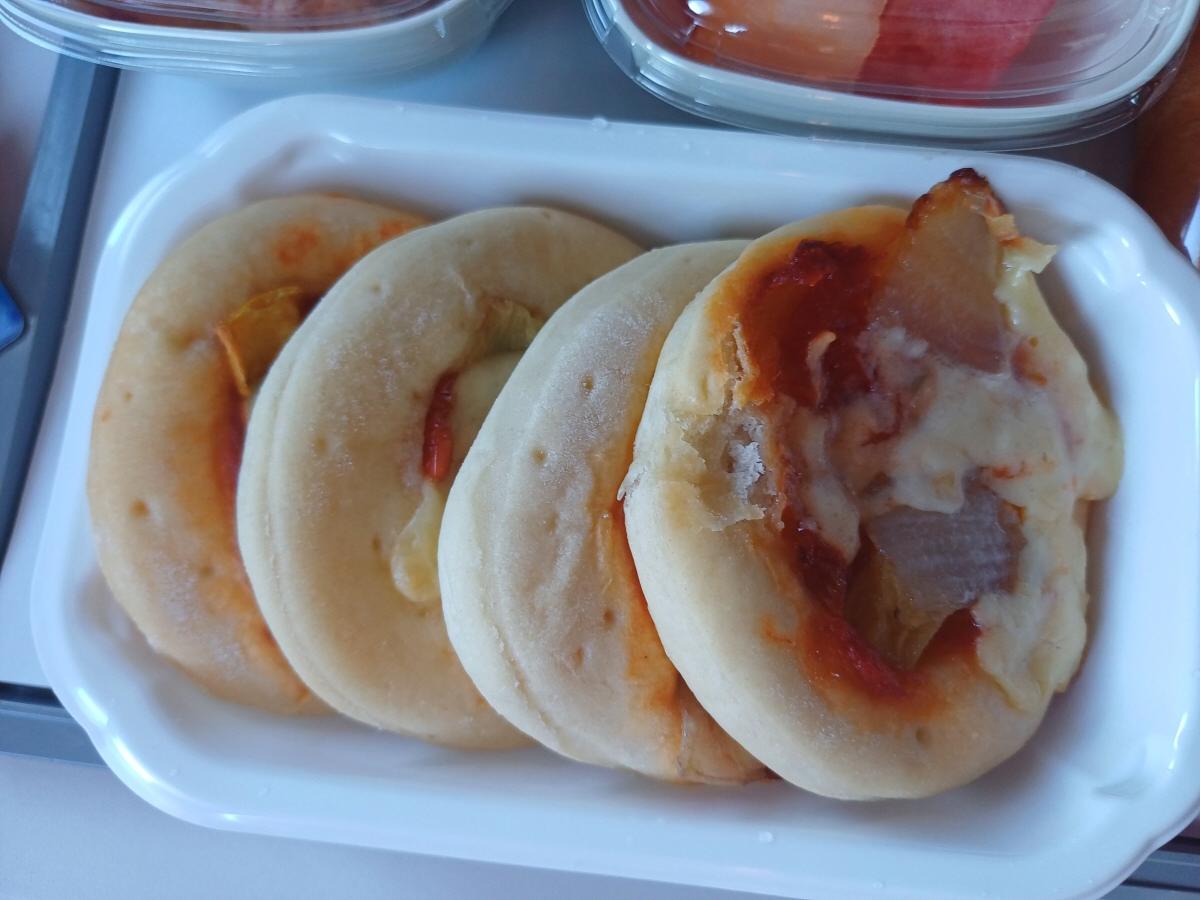 유아용 기내식은 사전 선택이 가능해서 피자가 나오는 기내식으로 선택을 했는데, 피자가 솔직히 맛이 없었다. 그래서 아이도 피자를 한 개만 먹고 과일만 조금 더 먹고 마무리했다. 빵도 귀엽긴 했는데 솔직히 팍팍한 게 영 맛이 없었다. 유아용 기내식은 기대하지 말자.