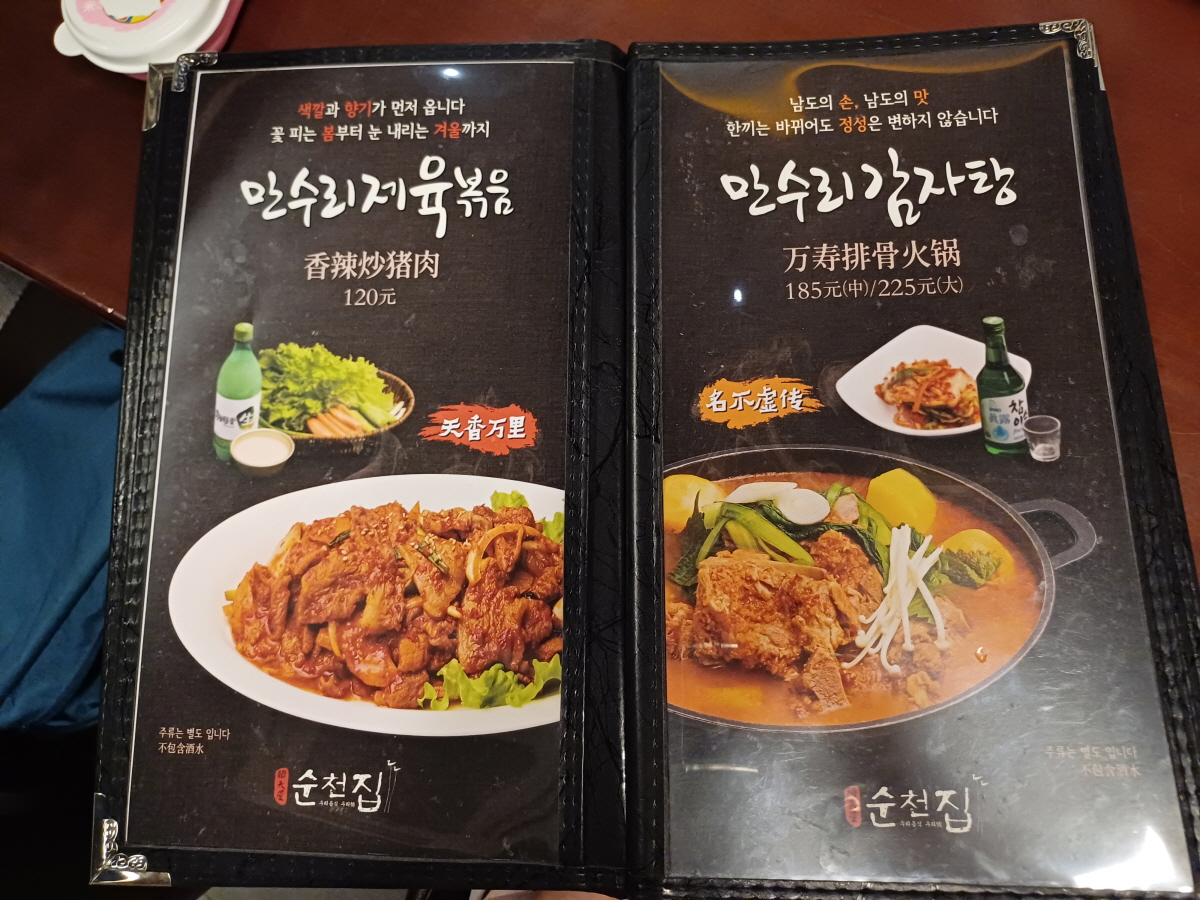 메뉴판을 살펴보니 가장 앞부분에 제육볶음과 감자탕이 있었는데, 둘 다 먹음직스럽게 생겼다.