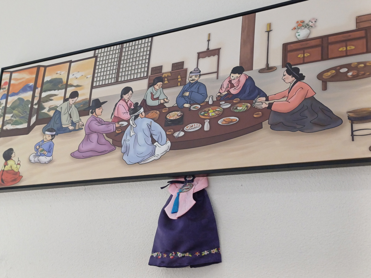 한국 느낌이 물씬 풍기는 그림과 작은 한복 장식.