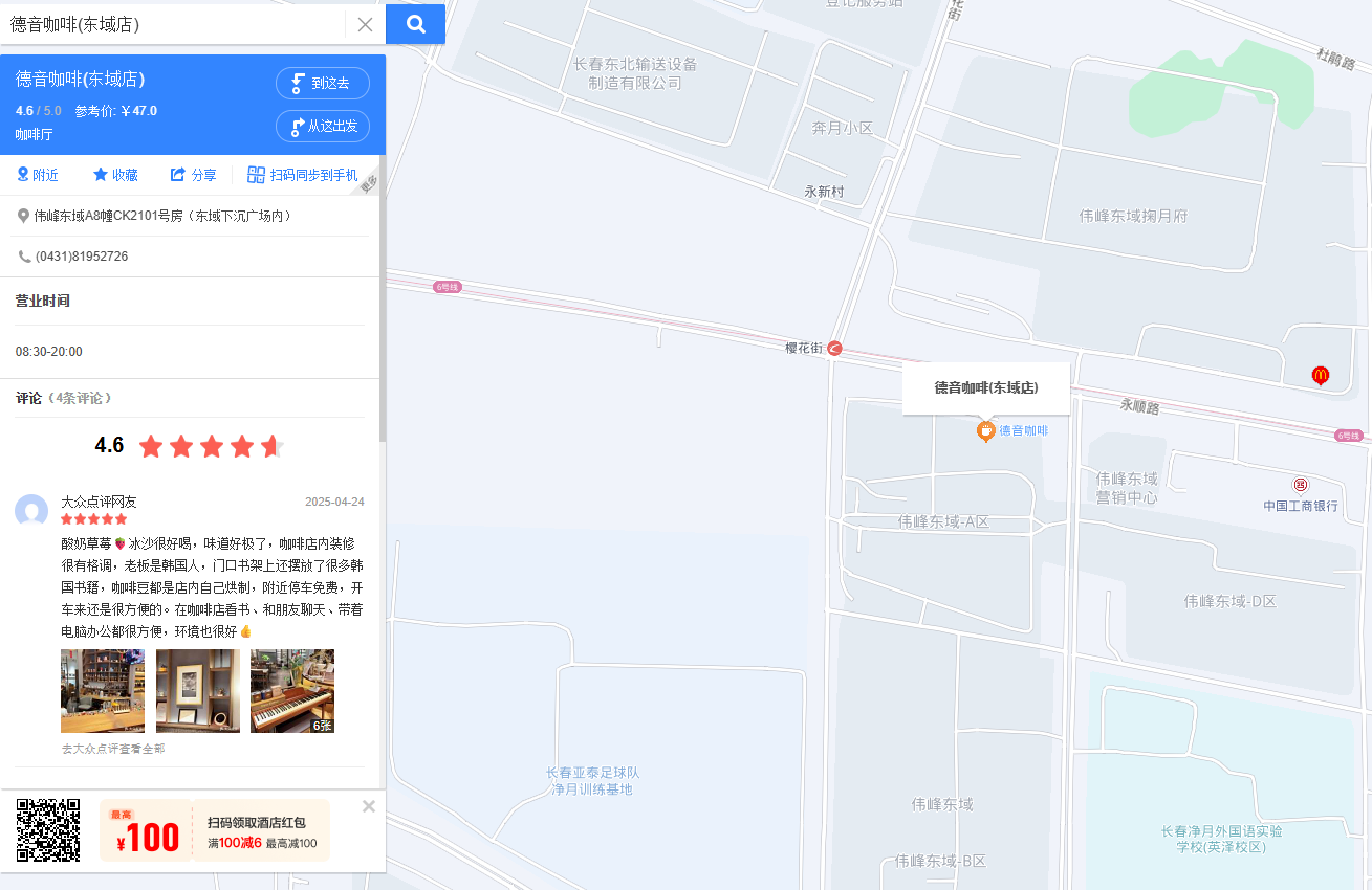 카페 이름은 Dein Coffee(德音咖啡)라는 곳으로 구글 지도에서는 검색이 되지 않았다. 바이두지도(百度地图)로 검색을 해보니 장춘 지하철 6호선 벚꽃길(樱花街) 역 근처에 위치하고 있었다.