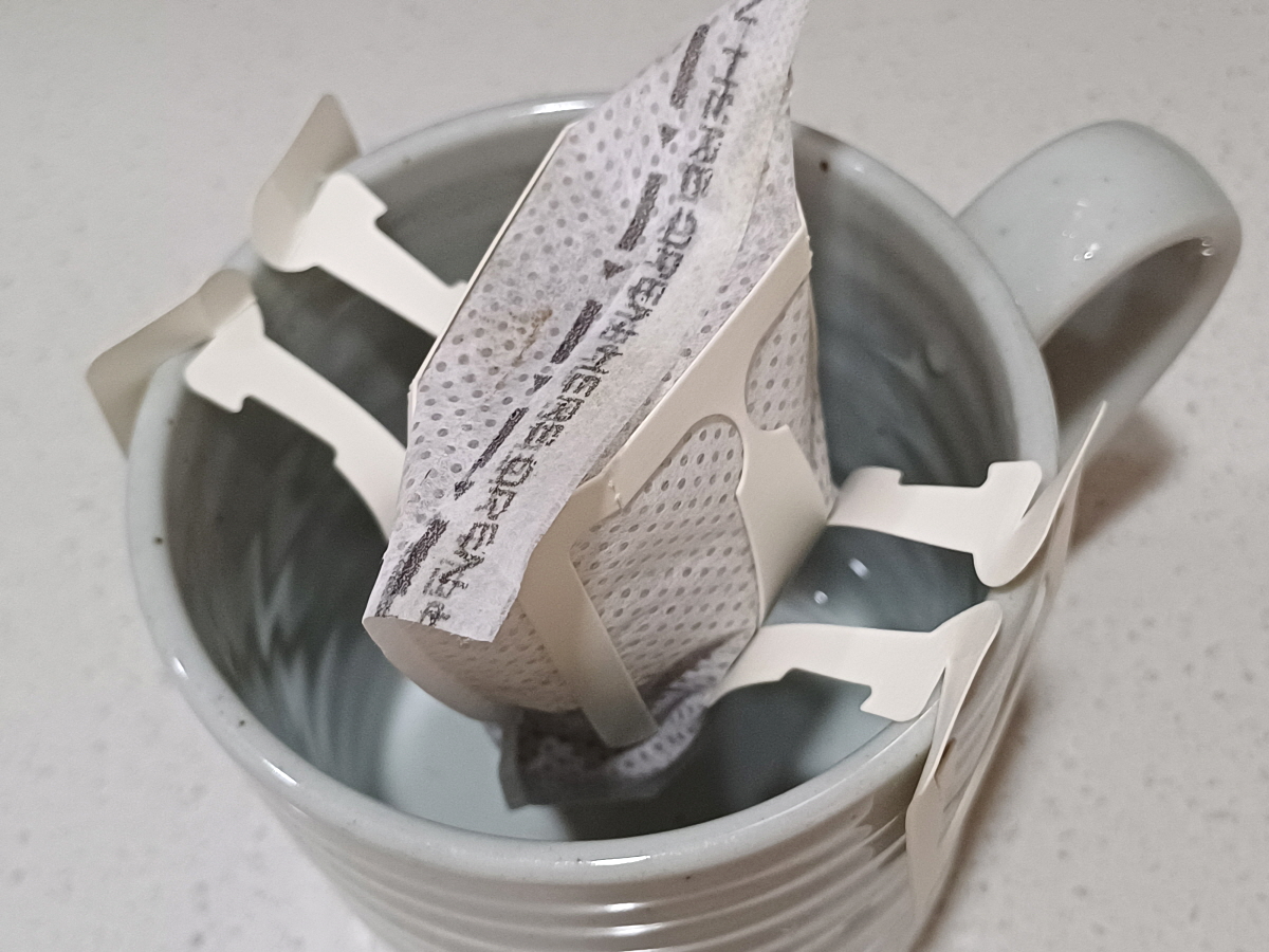 작은 머그컵에 드립백의 양 귀를 걸어준 뒤, 드립백 상단의 절단 부분을 조심스럽게 뜯어줬다.
