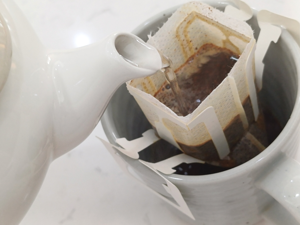 물을 끓인 후 잠시 식혀 물 온도가 약 90도가 되었을 때 드립백에 서서히 뜨거운 물을 부어줬다. 이 순간만큼은 나도 커피 장인이 된 느낌이 들었다. 이것이 바로 과정의 즐거움이랄까.