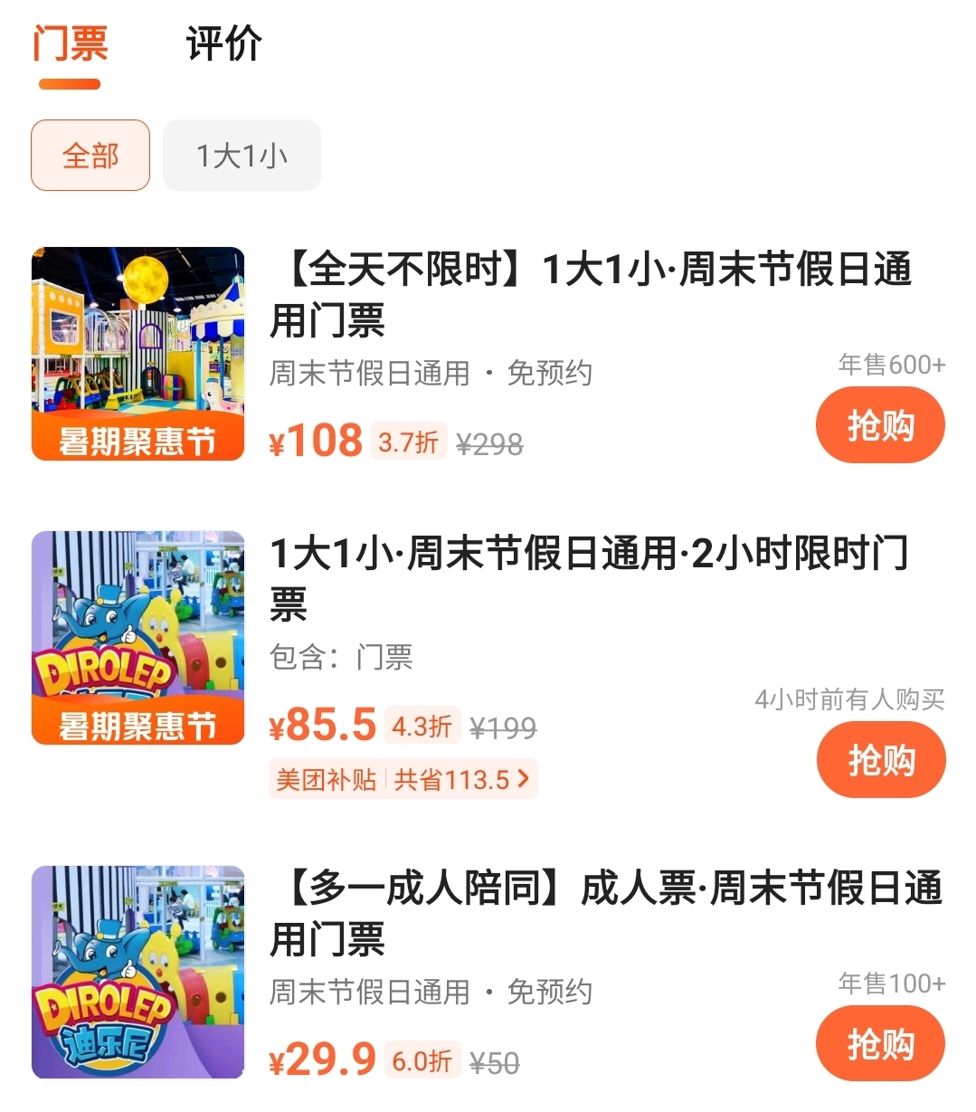 참조로 2시간 제한 이용권은 85.5위안, 동반 부모 추가 이용권은 29.9위안에 판매하고 있었다.