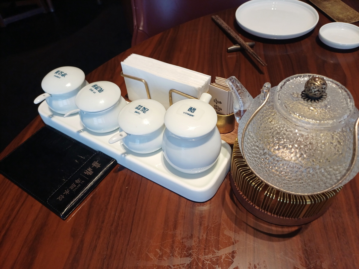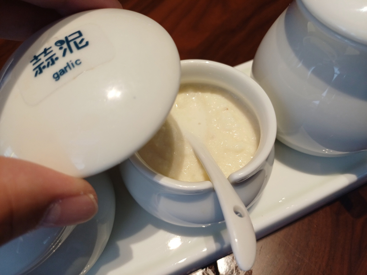 기본 소스들이 아주 정갈하게 세팅되어 있는데, 겨자소스,간마늘, 고추기름, 식초가 아주 깨끗하게 정돈되어 있었다. 크림 느낌이 나는 간 마늘이 아주 맛이 좋았다.