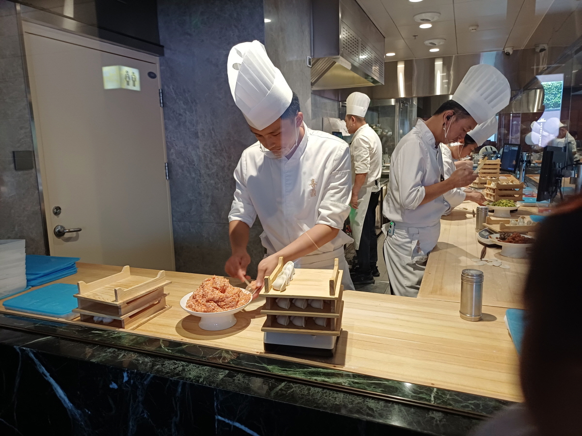 식당 테이블은 2층에 있는데, 올라오자마자 투명한 유리벽 너머로 주방에서 분주하게 일을 하는 요리사들의 모습이 나타났다. 특히 요리사들이 저울로 무게를 측정해 가면서 정성을 다해서 만두를 만드는 모습이 너무 인상적이었다.