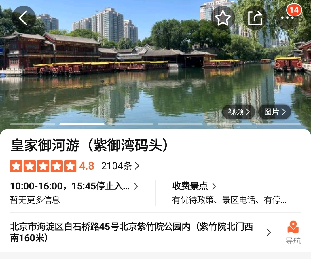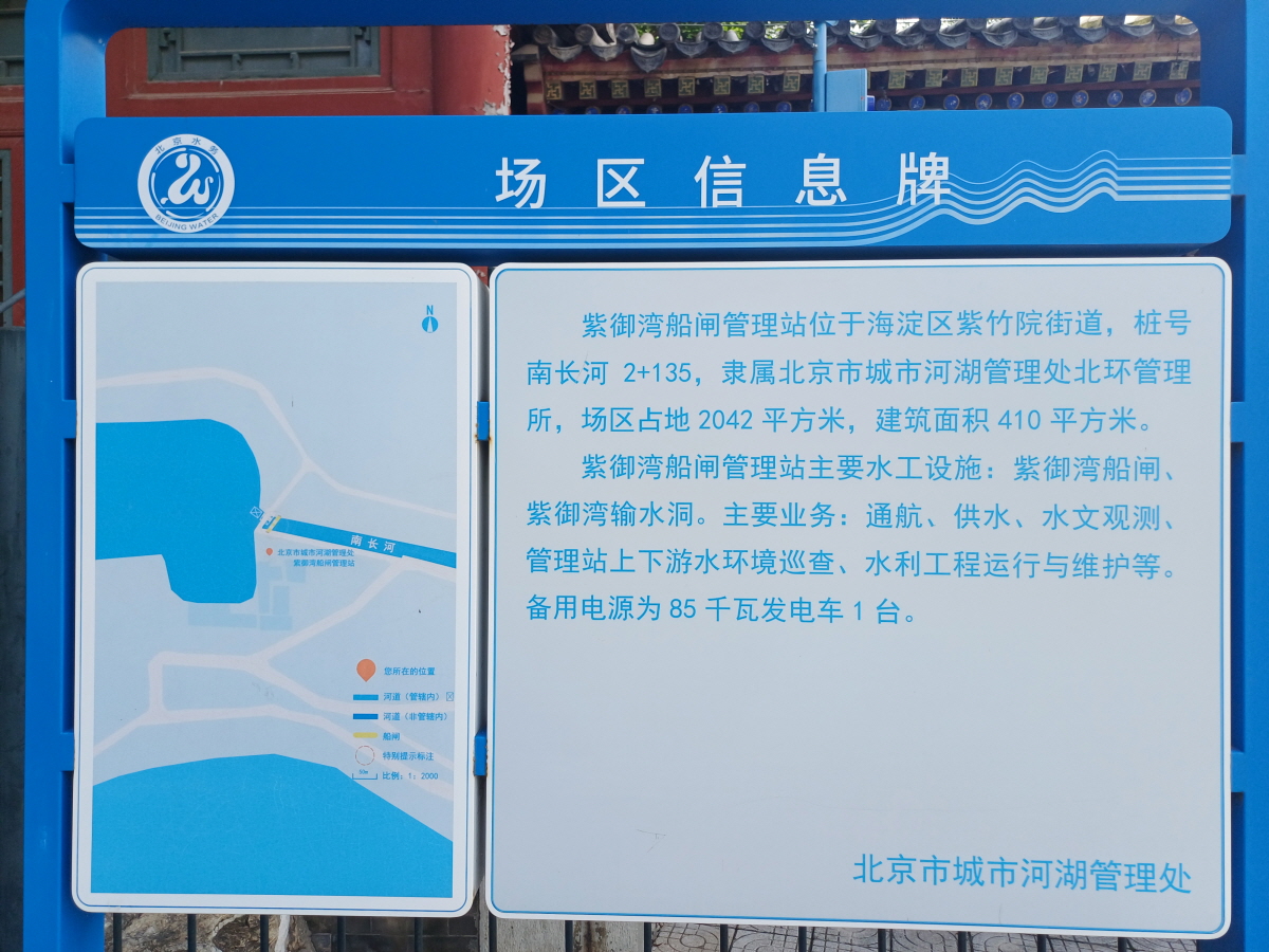 이곳 다리 위에 올라가면 남장하(南长河) 수로를 볼 수 있는데, 여기서 베이징 동물원에서 출발한 유람선이 유턴을 하고 있었다. 베이징동물원 부두에서 출발하여 이화원까지 가는 유람선을 탔을 경우에는 이곳에서 하차하여 자죽원 부두에서 배를 갈아타고 가야 한다.