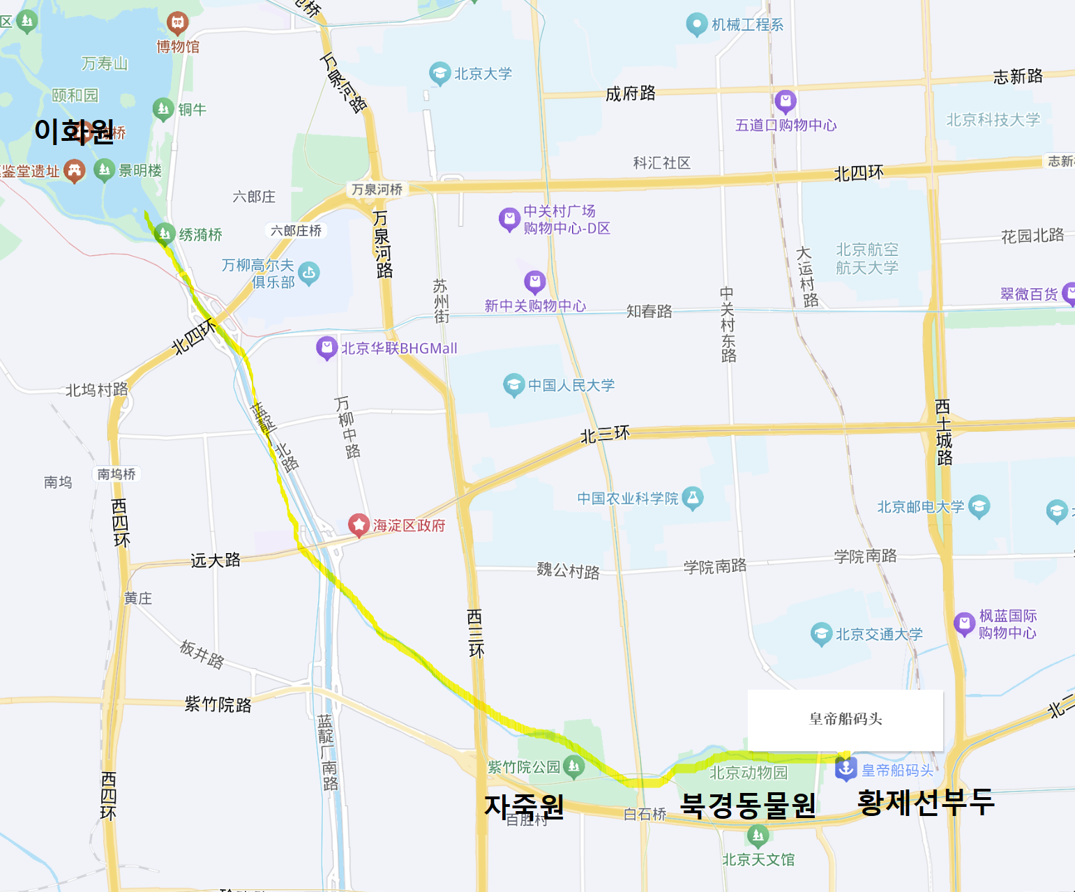 지난 베이징 동물원 관람 시 북쪽을 관통하는 수로를 봤었는데, 이 남장하(南长河)라는 수로가 이화원(颐和园)의 곤명호(昆明湖)까지 이어져 과거에 이 수로를 통해 황가의 사람들이 이동을 했었으며, 지금은 베이징 동물원에서 출발하여 자죽원(紫竹院)을 경유 후 이화원까지 갈 수 있는 유람선을 탈 수 있다는 것을 동물원 방문 이후 뒤늦게 알게 되었다.