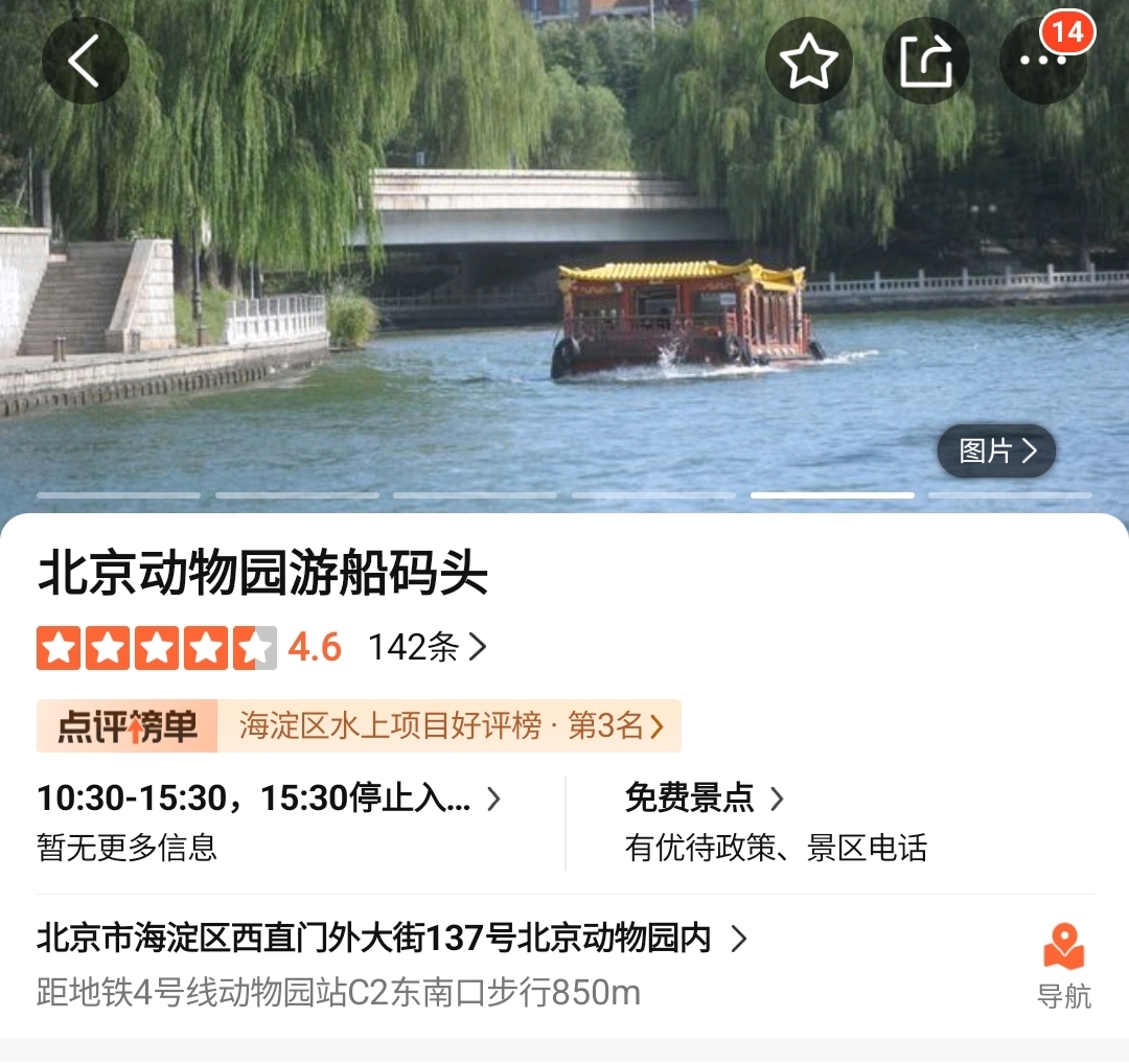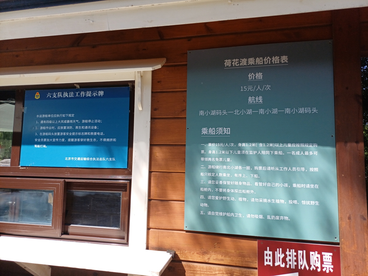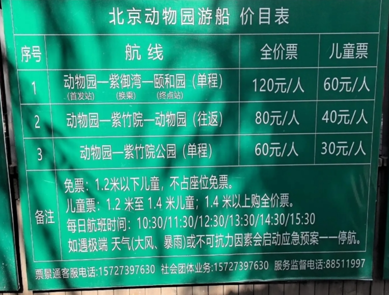 참조로 베이징 동물원 부두는 해양관으로 건너가는 다리부근에 위치하고 있는데, 이곳에서 10:30분부터 1시간 간격으로 배를 운영하고 있다. 동물원-자죽원-이화원 / 동물원-자죽원-동물원 / 동물원-자죽원 이렇게 3개의 루트를 운영하고 있으며, 입장료는 따종디엔핑(大众点评)에서 구매 시 저렴하게 구매가 가능하다.