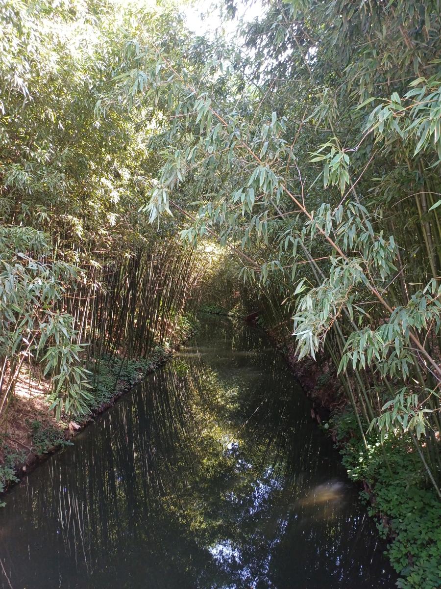 작은 수로 옆에 울창하게 조성되어 있는 대나무숲의 모습.