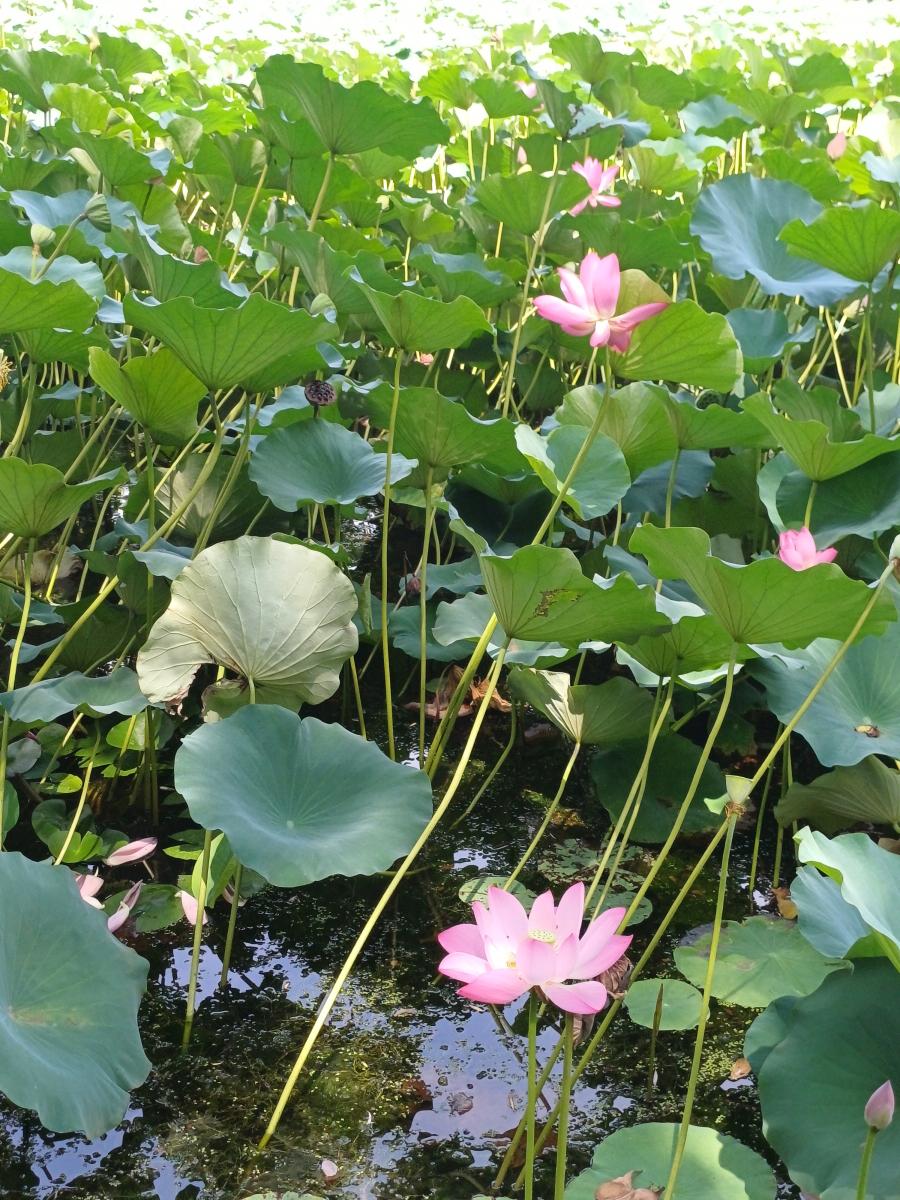 가장 먼저 만나 호수인 남소호(南小胡), 호수 안에 연꽃이 빽빽하게 자라고 있다.