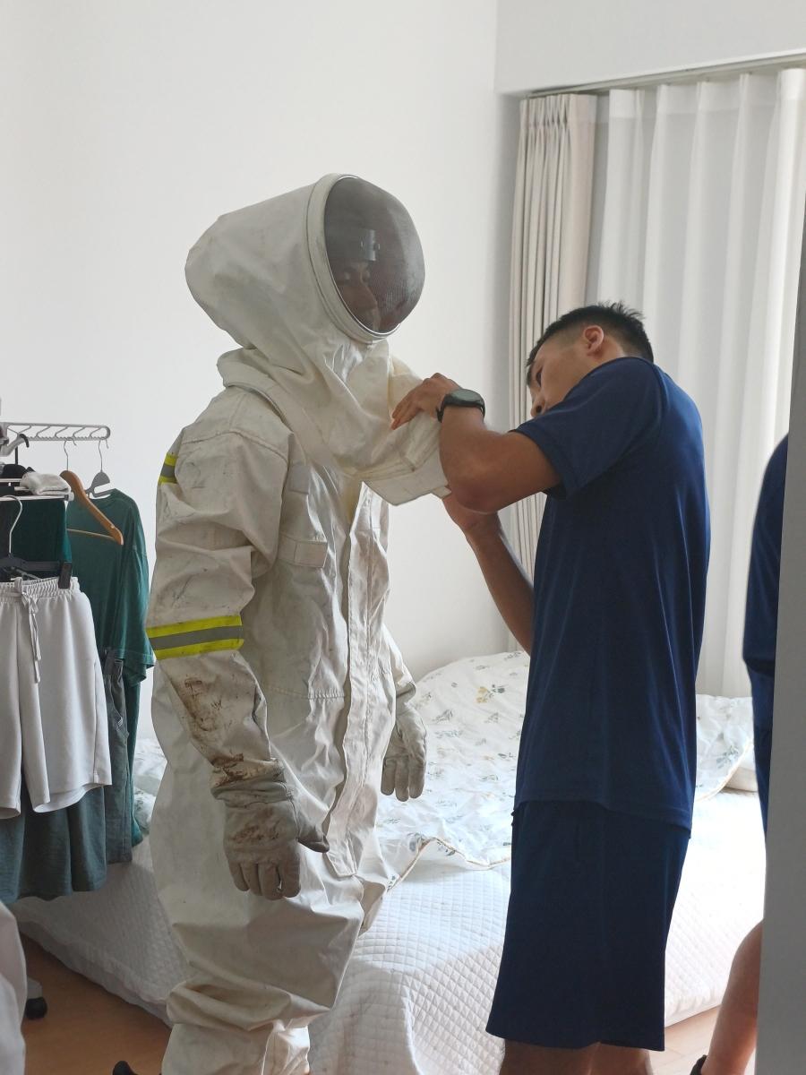 이어서 도착한 소방대원들이 준비해 온 철저히 벌집 제거 전용 방호복을 입었다. 소방대원에게 물어보니 최근 들어서 벌집 제거 출동이 빈번하다고 한다. 한구 소방대원들도 벌집 제거로 고생이 많다는 걸 봤었는데 여기도 비슷한 상황인 것 같았다.