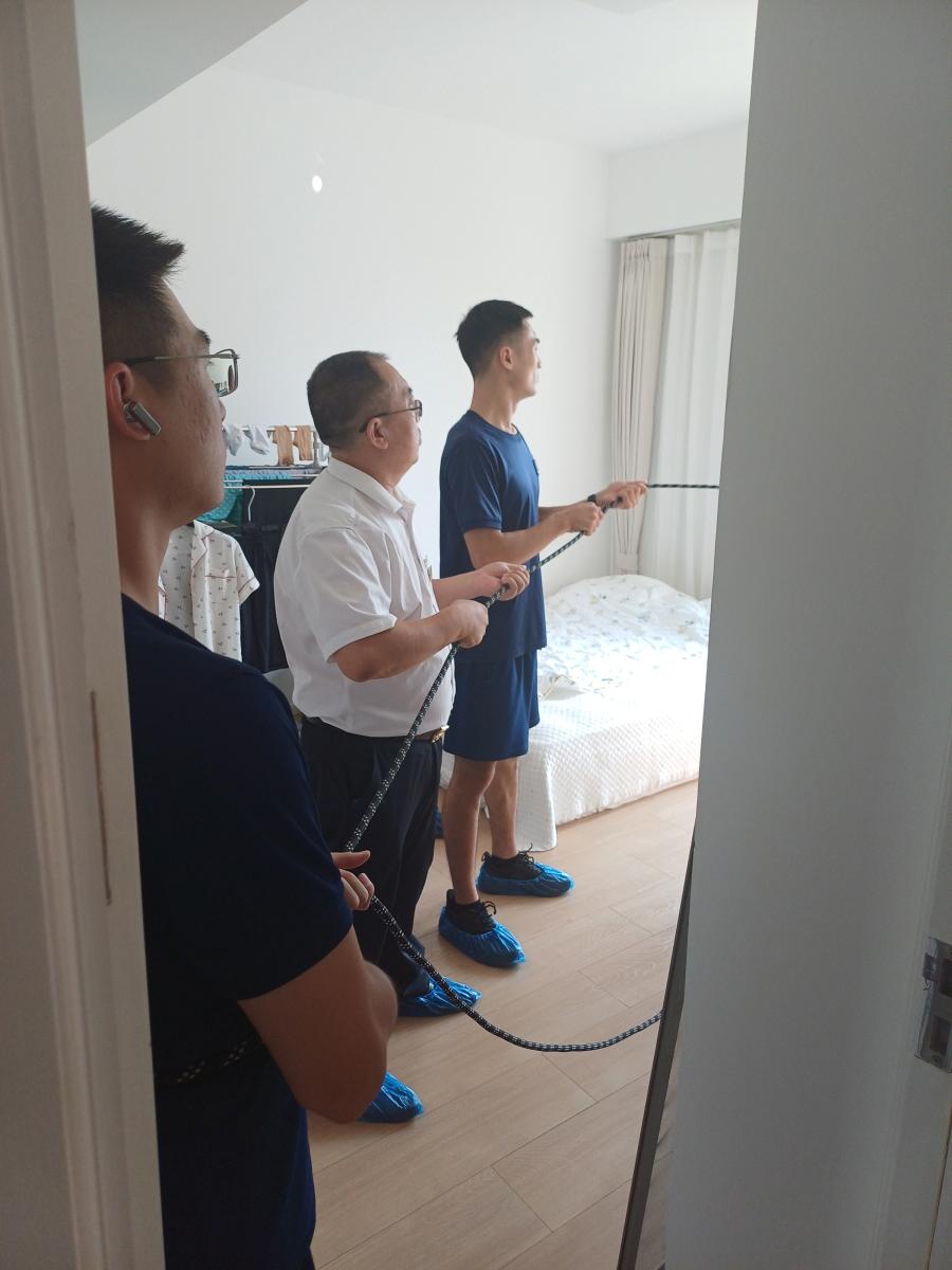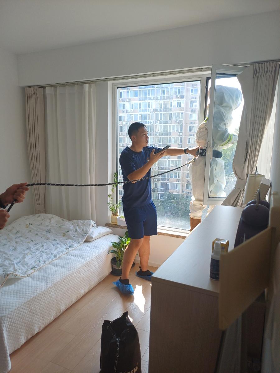 추락 방지를 위해 로프를 몸에 걸고, 다른 나머지 대원들이 줄을 붙잡아 주니 대원 한 명이 창문 밖으로 몸을 내밀었다.