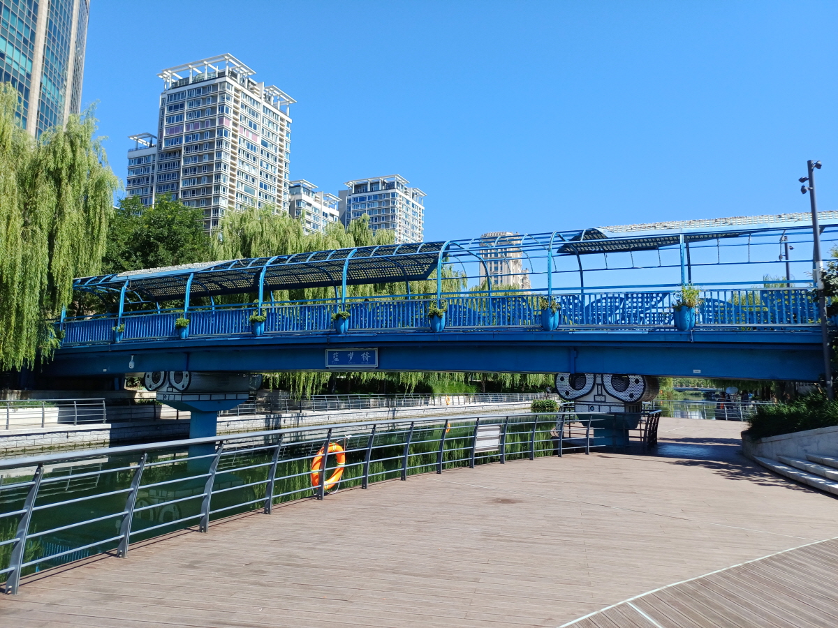 한참을 더 걸어가니 란멍교(蓝梦桥)라는 파란색 다리가 나오는데, 이 다리 부근에는 대형 쇼핑 단지인 솔라나(SOLANA/蓝色港湾)가 위치하고 있다.