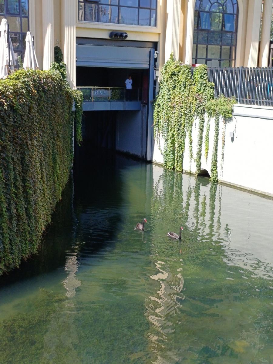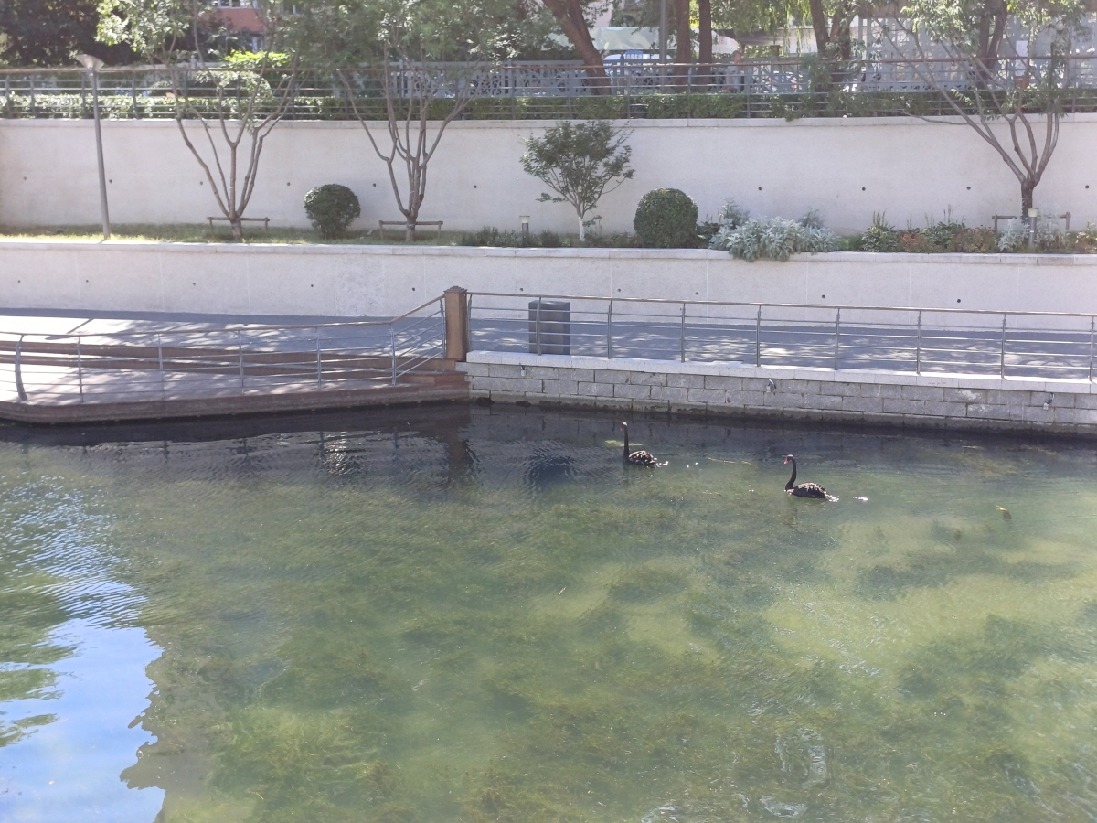 그 뒤에는 량마강완(亮马港湾)이라는 건물이 위치하고 있는데, 건물 아래 수로에서 헤엄치고 있는 두 마리의 흑고니를 볼 수 있었다.