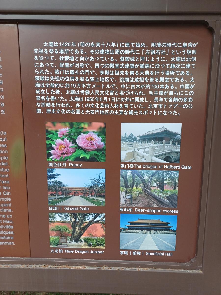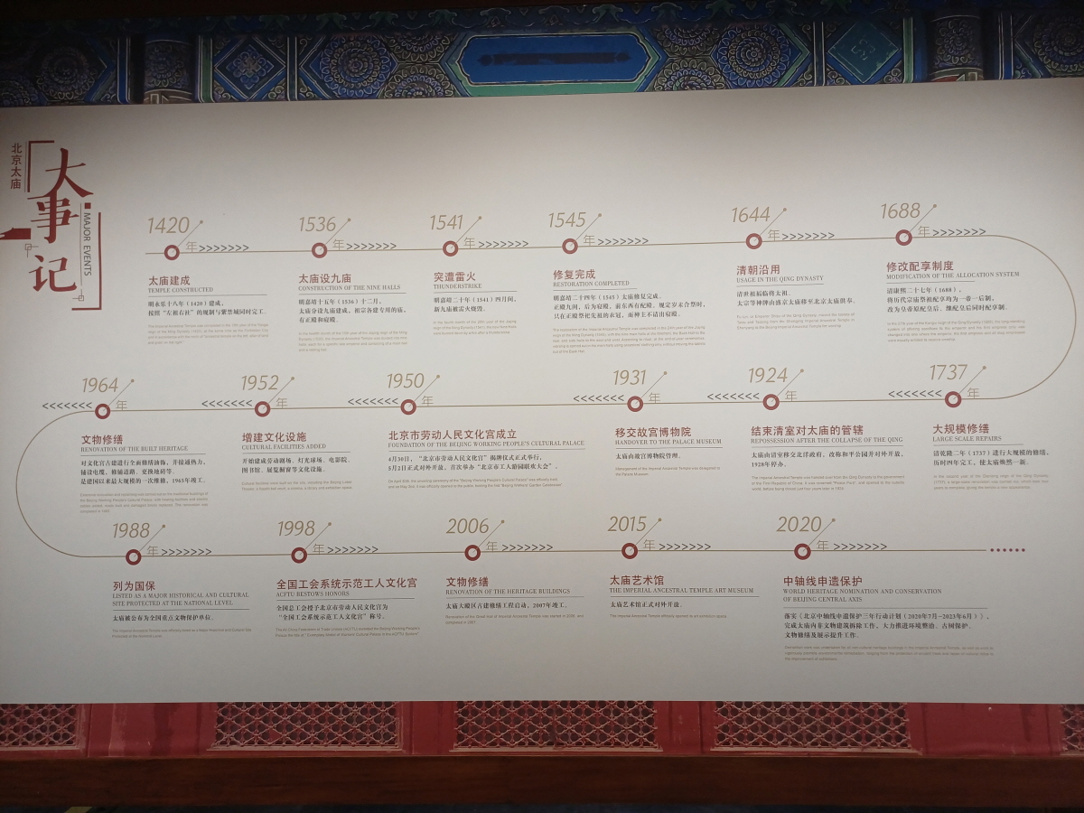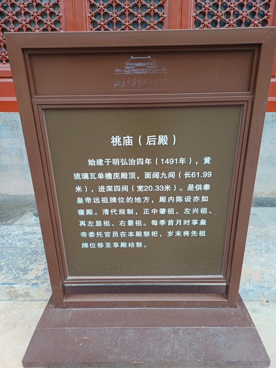 베이징 노동인민문화궁(劳动人民文化宫)은 천안문 동측에 위치한 중국에서 가장 중요한 고건축 군 중 하나로, 본래 명·청 두 왕조의 황실 가묘였던 '태묘(太庙)'이다. 태묘는 1420년(명 영락 18년)에 건립되어 황실의 조상 신위를 모시고 제사를 올리던 곳으로, “좌조우사(左祖右社)”의 규제를 따라 자금성 동쪽에 자리한다.