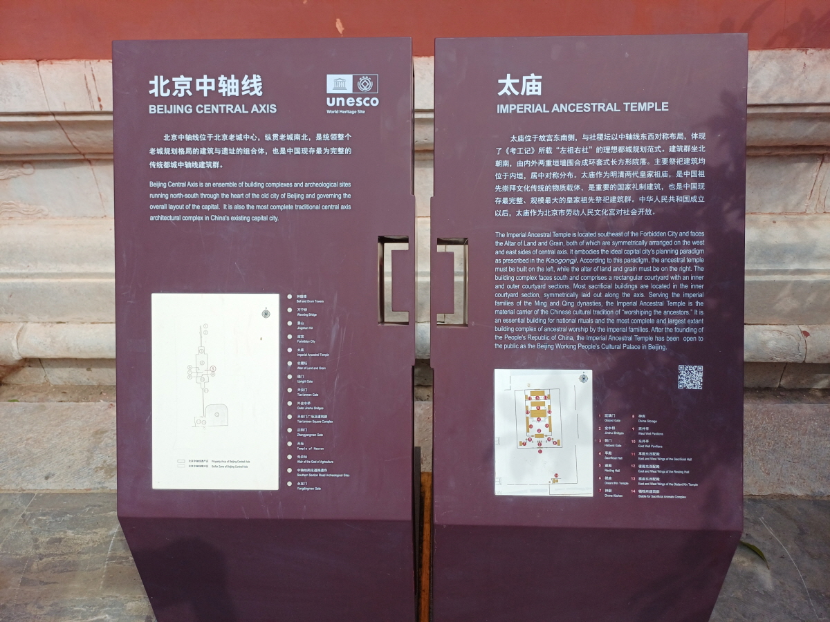 바로 베이징 자금성 오른편에 자리 잡고 있는 태묘(太庙)와 왼편에 자리 잡고 있는 사직단(社稷坛)이다. 이 두 곳은 자금성의 한 부분이겠거니 하면서 그간 관심조차 없던 곳이었는데, 중축선 주요 유산에 포함된 곳이니만큼 이 두 곳도 마음먹고 방문을 해보기로 했다.