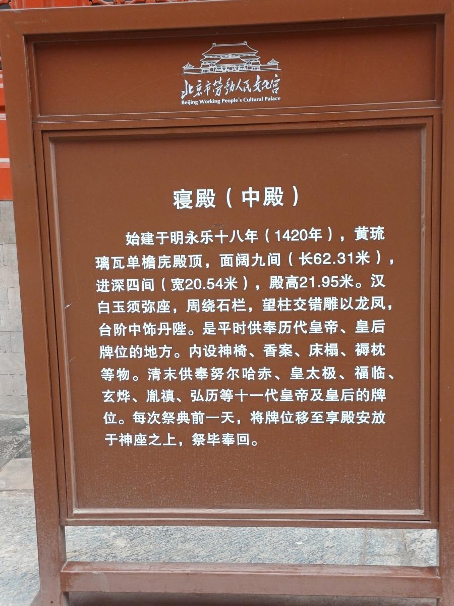 침전(寝殿)은 황제와 황후 신위를 모신 곳이다. 또한 700여 그루의 고송과 희귀한 수목이 숲을 이루고 있어 경관과 역사적 가치가 뛰어나다. 태묘는 1924년 일반에 공개된 이후, 1950년 정식으로 노동인민문화궁으로 개편되었다. 이는 주은래 총리의 제안과 정무원의 승인으로 이루어졌으며, ‘北京市劳动人民文化宫’라는 현판은 마오쩌둥이 직접 쓴 글씨로 1950년 5월 1일 개관하였다.