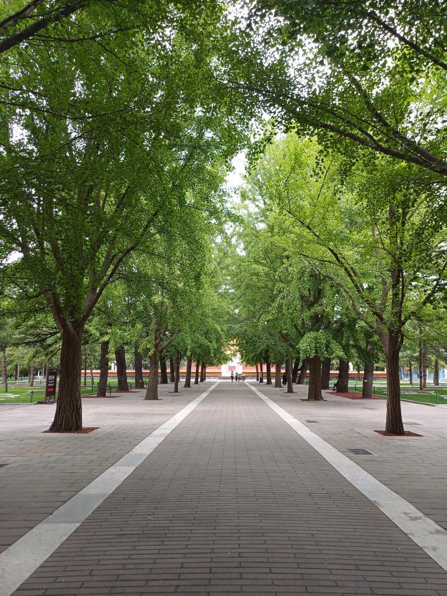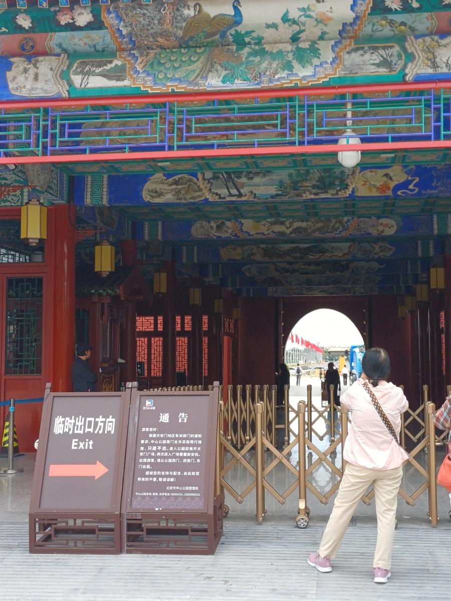 공원의 남문 너머로 어렴풋이 보이는 천안문 광장의 모습. 이 문을 통해서 공원으로 들어올 순 있지만 밖으로 나갈 순 없다. 천안문 광장을 가기 위해서는 별도의 예약을 해야 한다.