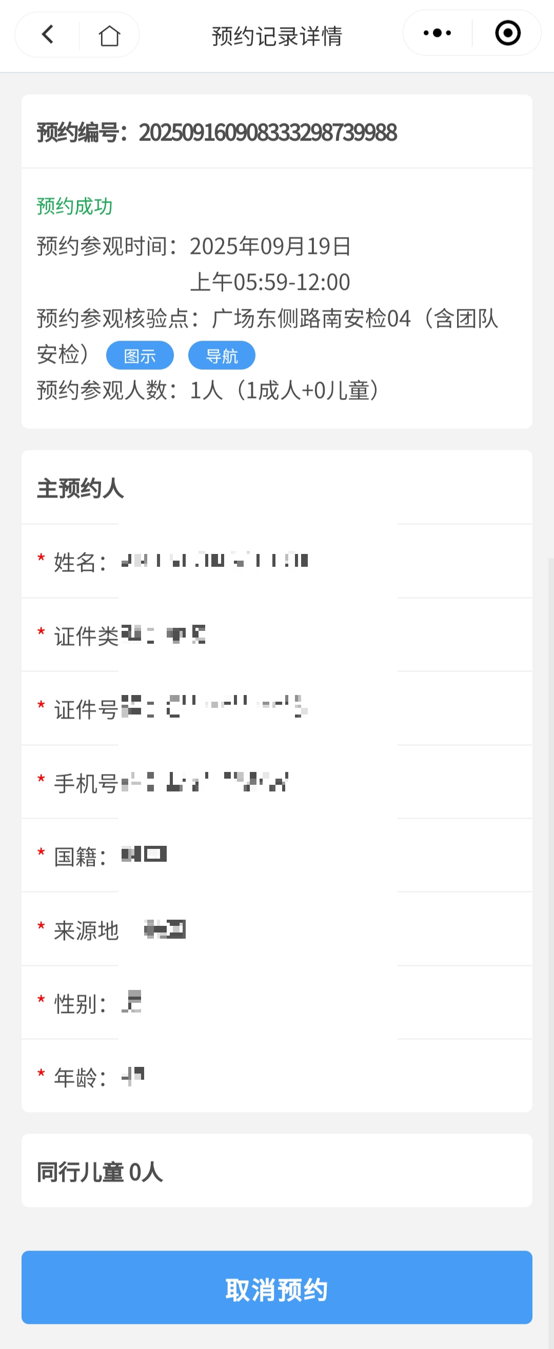 1분 정도 심사 후 예약 완료가 뜬다. 이렇게 예약이 완료되었으면 예약일 당일 천안문 광장에 방문해서 보안 검색대에서 신분증(여권)을 제출하면 입장 가능하다.