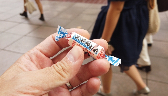 상하이 특산물 판매 상점에 들어가서 상하이의 전통간식인 우유맛 누가사탕 사오바이토우(小白兔)와 나비파이를 구매해서 맛을 봤다.
