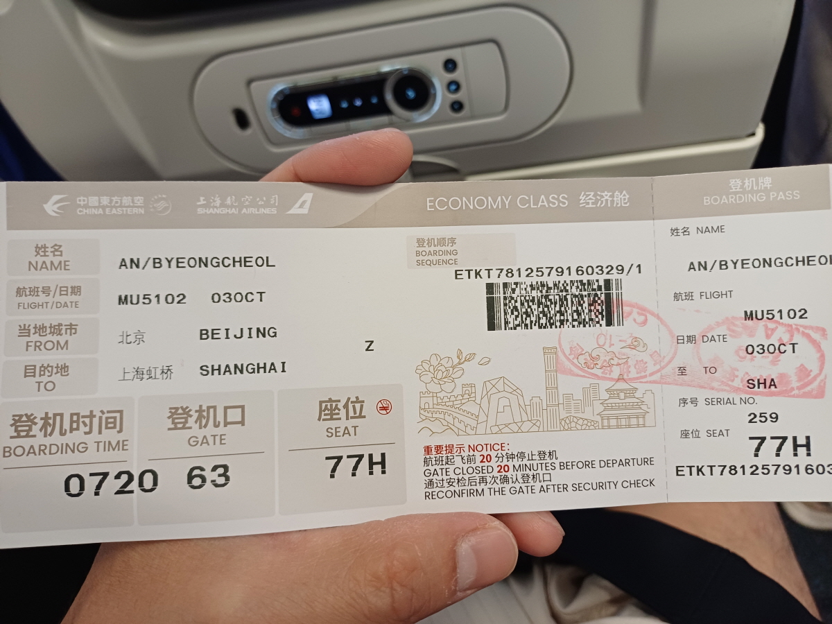 베이징에서 상해까지 중국 동방항공 MU5102(08:00-10:20)항편을 이용해서 이동을 했고, 아침 시간이라 기내식은 간단하게 만두 같은 것이 나왔다.
