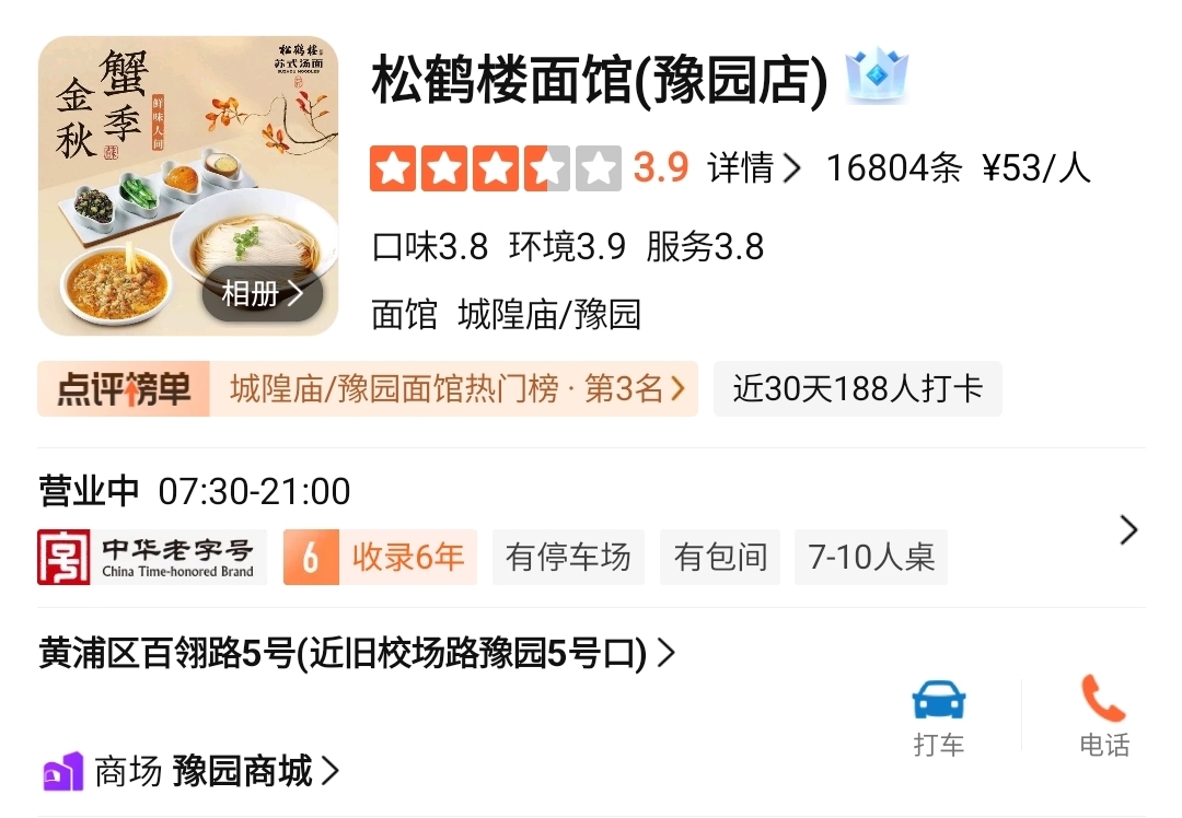 송학루(松鹤楼)는 200년 이상의 역사를 가진 중국 장쑤성 쑤저우의 전통 음식점 브랜드로, 상하이 매장은 정통 쑤식(苏式) 요리를 현대적으로 재해석해 제공합니다. 대표 메뉴로는 쑤식면(苏式面), 게살요리, 전통 간장찜이 있으며, 고급스럽고 정갈한 맛으로 인기가 높습니다.
