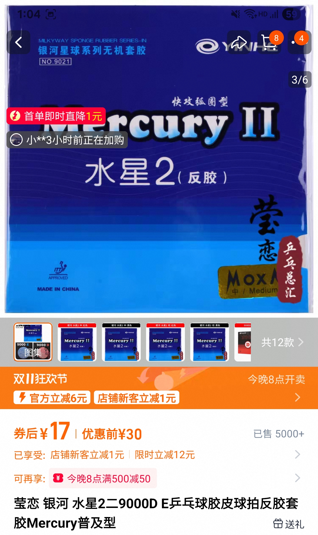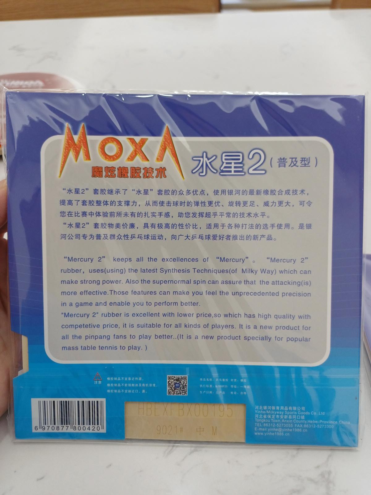중국 인터넷 쇼핑몰에 판매량 순위로 조회를 해보니 나름 상위권에 아주 저렴한 러버가 랭크되어 있었다. 바로 YINHE라는 브랜드의 머큐리2라는 러버인데, 중국 탁구 용품 브랜드 YINHE에서 저렴하게 탁구를 즐기라는 의도를 가지고 만든 가성비 러버라고 한다. 가격은 러버 한 장에 RMB17, 한국돈으로 단돈 3,400원이다.