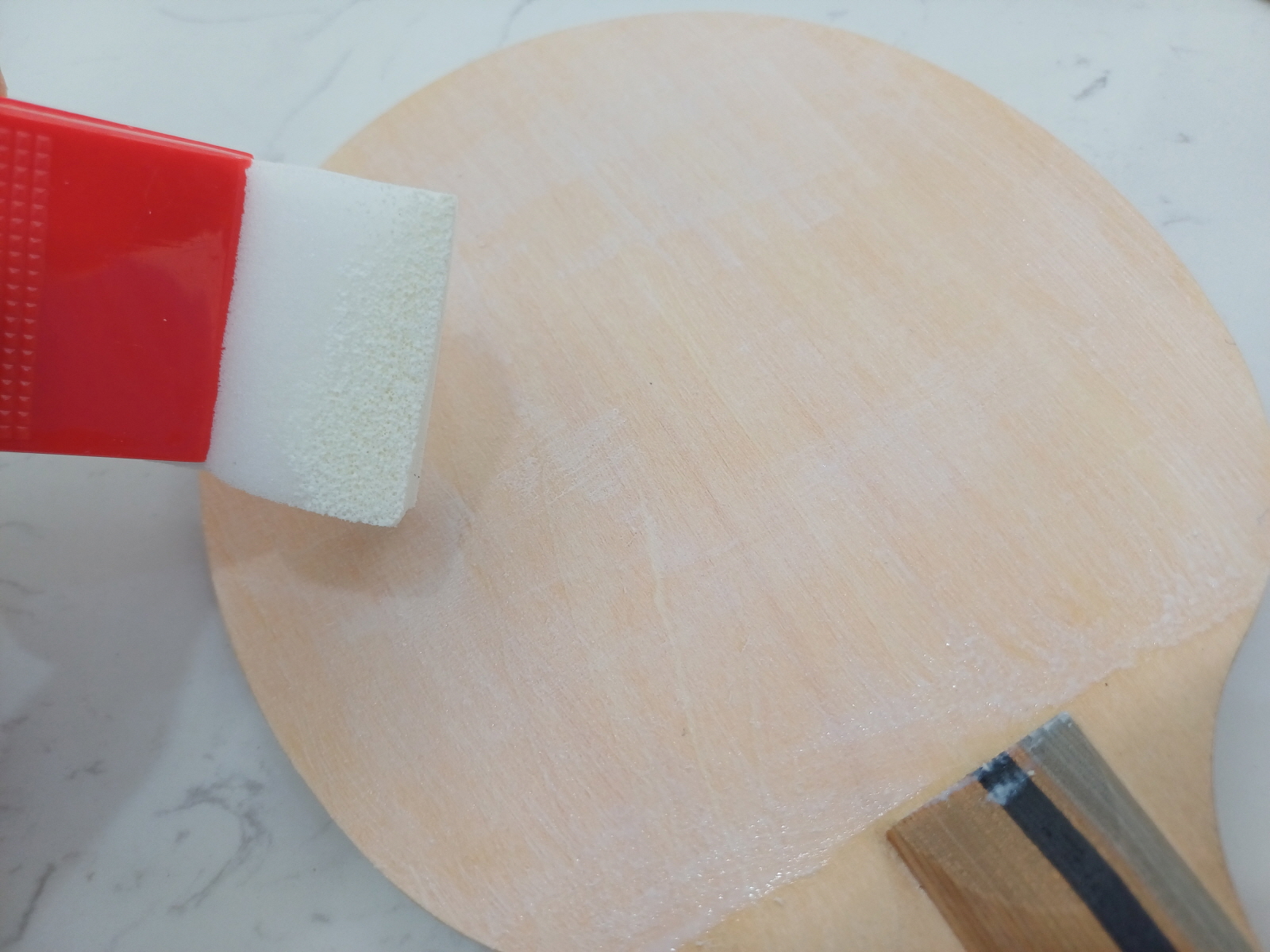 스펀지로 풀을 블레이드와 러버에 잘 펴바르고 말린 뒤, 보온병으로 밀면서 붙이고 가위로 가장자리를 잘라줬다. 러버교체 쉽구먼.