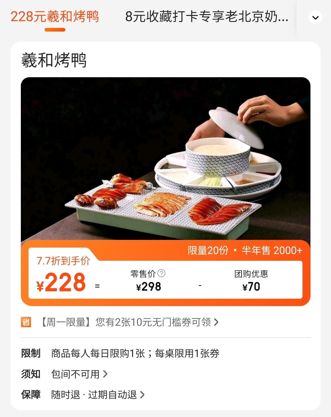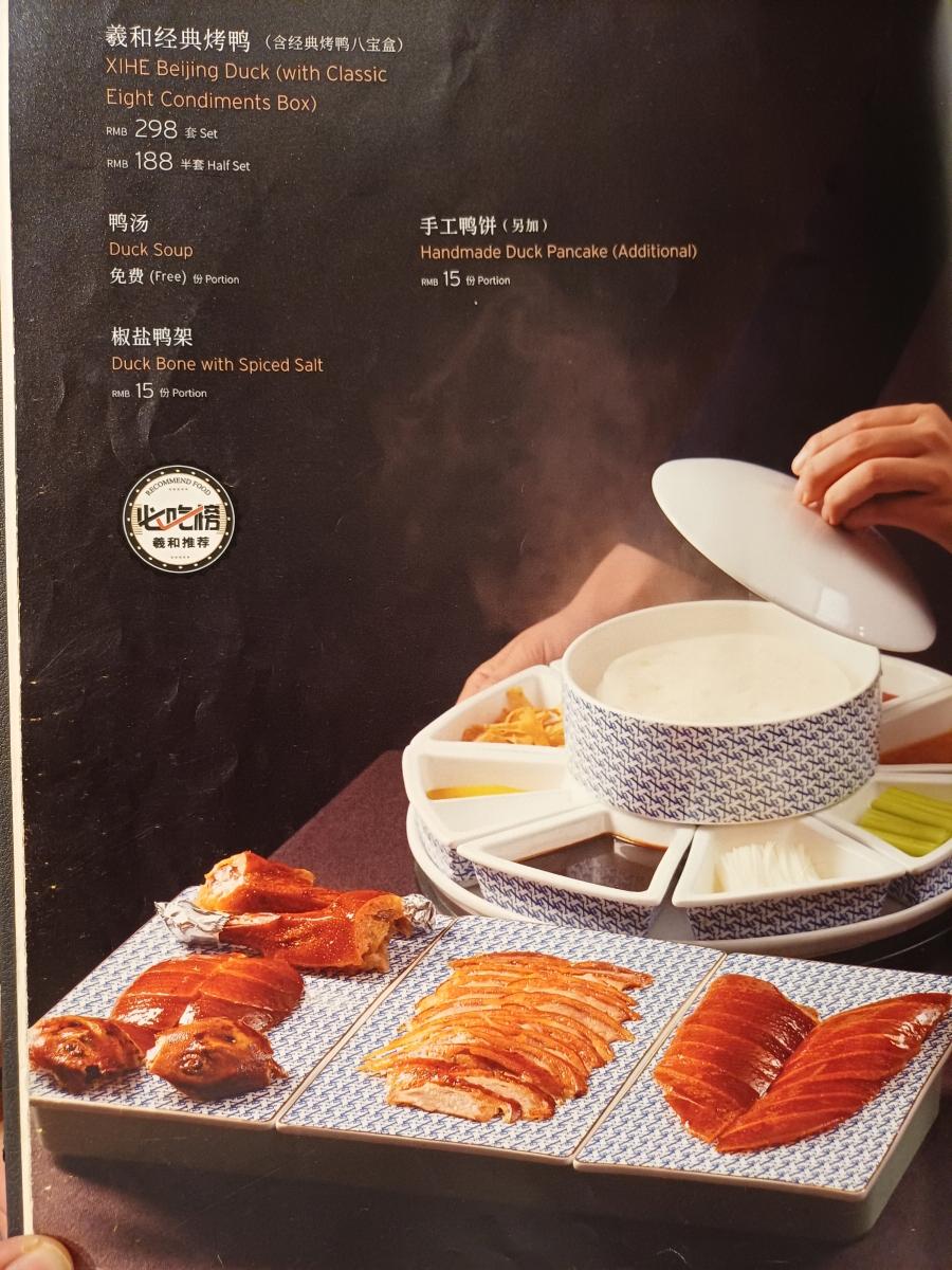 메뉴판을 살펴보니 가장 첫 장은 역시 대표메뉴인 베이징 카오야, 1마리 기준 RMB298, 반마리는 RMB188으로 가격대가 조금 나가는 편이었다. 나는 따종디엔핑(大众点评)에서 1마리를 RMB228위안짜리 할인 쿠폰을 구매해서 조금 저렴하게 구매를 했다.