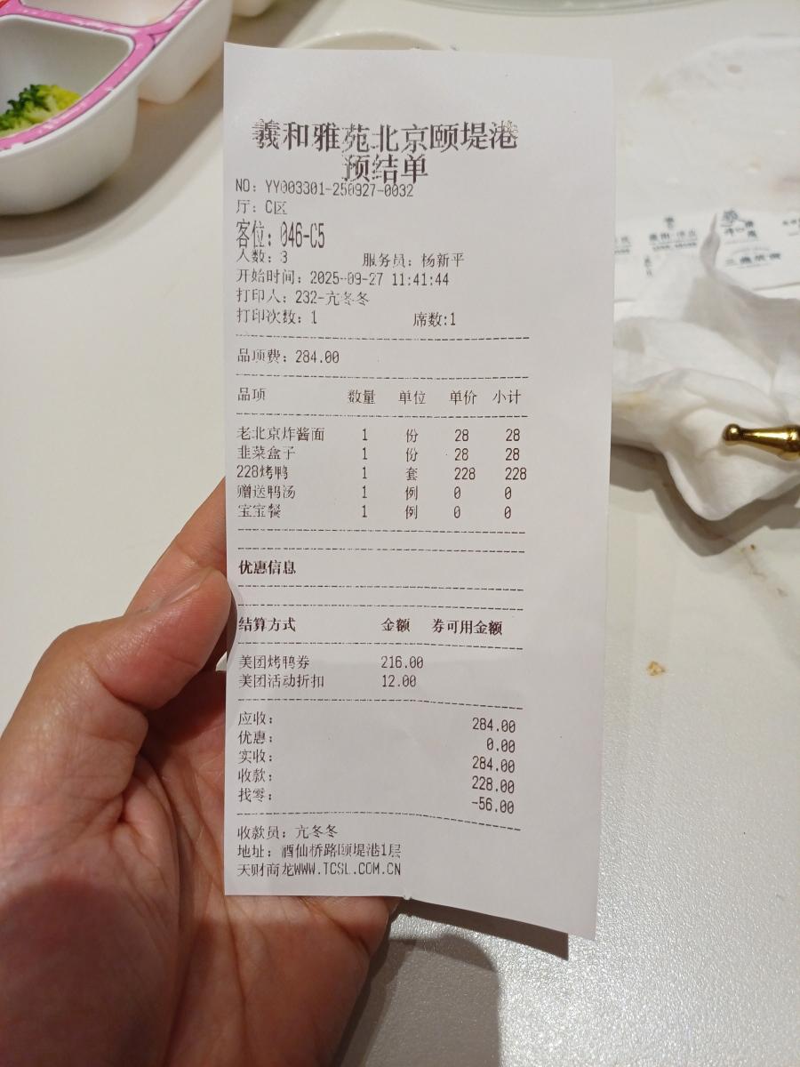 베이징 카오야 한 마리와, 간단한 요리 두 개를 합쳐서 RMB284, 셋이서 배부르게 먹은 것 치고는 적당한 가격대였다.